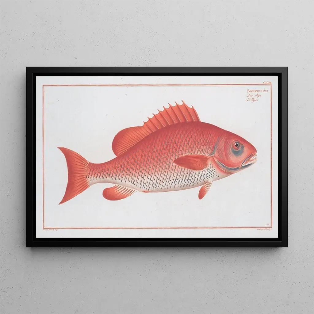Bodianus Aya : de schoonheid van de diepe zee Bodianus Aya is een fascinerend kunstwerk dat de kijker onderdompelt in de kleurrijke en levendige wereld van de onderwaterbodems. Dit schilderij, gemaakt door Marcus Elieser Bloch, benadrukt een vis met opvallende tinten, wat de rijkdom van de aquatische biodiversiteit illustreert. De nuances van blauw en groen, gecombineerd met accenten van geel en oranje, creëren een dynamische en boeiende compositie. De precisie van de details, zowel in de weergave van de vis als in de omliggende elementen, getuigt van het talent van de kunstenaar en zijn wens om de schoonheid van de natuur te eren. Marcus Elieser Bloch : pionier in artistieke ichthyologie Marcus Elieser Bloch, geboren in 1723, was een Duitse kunstenaar en naturalist die erkend werd voor zijn bijdragen aan de ichthyologie, de studie van vissen. Zijn werk werd beïnvloed door de wetenschappelijke ontdekkingen van zijn tijd, en hij wist kunst en wetenschap te combineren om nauwkeurige en esthetische weergaven van mariene soorten te creëren. Bodianus Aya is een van zijn meest beroemde kunstwerken, dat niet alleen de schoonheid van vissen toont, maar ook het belang van het behoud van mariene ecosystemen benadrukt. Bloch heeft een blijvende erfenis achtergelaten, die vele kunstenaars en wetenschappers door de eeuwen heen heeft geïnspireerd. Een decoratief stuk met vele voordelen De kunstdruk van Bodianus Aya is een decoratief stuk dat een vleugje exotisme aan uw interieur zal toevoegen. Of het nu in een woonkamer, kantoor of slaapkamer is, dit doek zal de aandacht trekken en verwondering opwekken. De kwaliteit van de afdruk garandeert een goede weergave van de kleuren en details van het originele werk, waardoor deze kunstdruk een ideale keuze is voor liefhebbers van natuur en kunst. Door dit schilderij in uw inrichting te integreren, creëert u een ruimte die de schoonheid van de oceanen en de artistieke erfenis van Marcus Elieser Bloch viert.