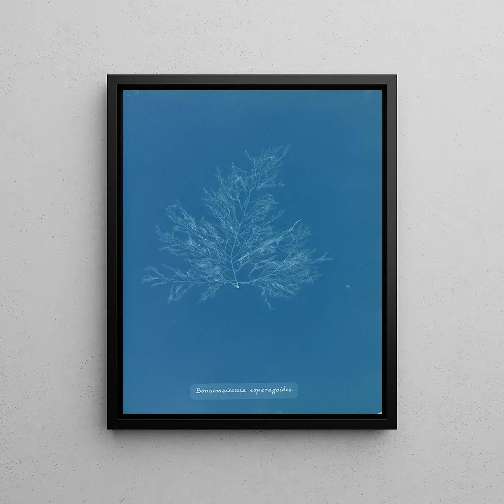 Het werk van Anna Atkins onderscheidt zich door haar gebruik van cyanotype, een fotografische techniek die diepe blauwe impressies mogelijk maakt. Deze keuze van procédé geeft de "Bonnemaisonia asparagoides" een aura die zowel mysterieus als boeiend is. Elke impressie is een dialoog tussen de kunstenaar en haar onderwerp, een minutieuze verkenning van de vormen van planten die de eenvoudige voorstelling overstijgt. De precisie van de details, de fijnheid van de lijnen en de rijkdom van de blauwtinten maken van dit werk een iconisch voorbeeld van de fusie tussen kunst en wetenschap. Atkins beperkt zich niet tot het reproduceren van de natuur; ze interpreteert haar, geeft haar een nieuw leven en moedigt ons aan om onze relatie met de omgeving opnieuw te ontdekken.