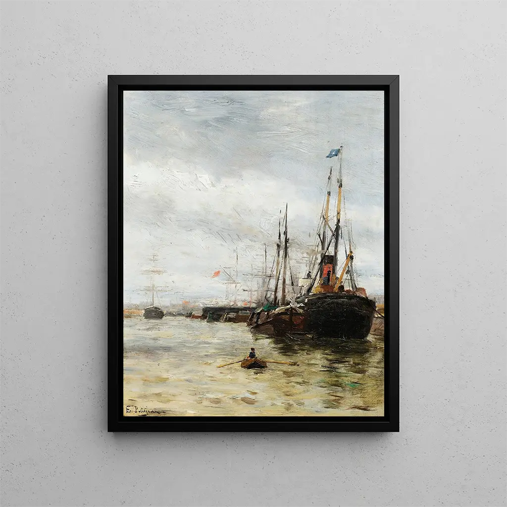 Reproductie Bateaux au port - Edmond-Marie Petitjean – Boeiende introductie In de betoverende wereld van de kunst slagen sommige werken erin de essentie van tijd en ruimte zelf vast te leggen. "Bateaux au port - Edmond-Marie Petitjean" is een van die creaties die, door zijn verfijning en poëzie, de toeschouwer meeneemt naar een universum waar zee en land harmonieus verweven zijn. De scène die Petitjean afbeeldt, roept niet alleen een bevroren moment in de tijd op, maar ook een sfeer doordrenkt van sereniteit en contemplatie. De nuances van blauw en oker, evenals het zachte licht dat het schilderij omhult, nodigen uit tot reflectie over de vergankelijke schoonheid van het maritieme leven. Bij het bekijken van dit werk voelt men bijna de lichte beweging van de golven en de adem van de wind, alsof men zelf aanwezig is in deze levendige haven. Stijl en uniekheid van het werk De stijl van Edmond-Marie Petitjean onderscheidt zich door zijn vermogen om realisme te combineren met een subtiele impressionistische toets. In "Bateaux au port" lijkt elke penseelstreek een echo van de vloeiende bewegingen van het water en de witte zeilen die trots in de wind staan. De minutieuze details van de boten, gecombineerd met de bijna dromerige weergave van het omliggende landschap, geven het werk een sfeer die zowel tastbaar als dromerig is. Petitjean speelt vakkundig met het licht, waardoor reflecties op het water lijken te dansen onder de zonnestralen. Dit schilderij is niet slechts een voorstelling van een haven, maar een uitnodiging om de emoties te verkennen die de zee oproept, door middel van contemplatie van de natuur en menselijke activiteiten. Het kleurenpalet dat de kunstenaar heeft gekozen, dat tussen warme en koele tinten oscilleert, versterkt deze dualiteit tussen rust en beweging, de immobiliteit van de haven en de levendigheid van de boten. De kunstenaar en zijn invloed Edmond-Marie Petitjean, een iconische figuur van de Barbizon-school, wist zich te vestigen in het Franse artistieke landschap van de 19e eeuw. Geïnspireerd door de grote meesters van zijn tijd, ontwikkelde hij een stijl die zijn eigen was, waarbij hij minutieuze observatie van de natuur combineerde met poëtische gevoeligheid. Zijn werk wordt gekenmerkt door een voortdurende zoektocht naar
