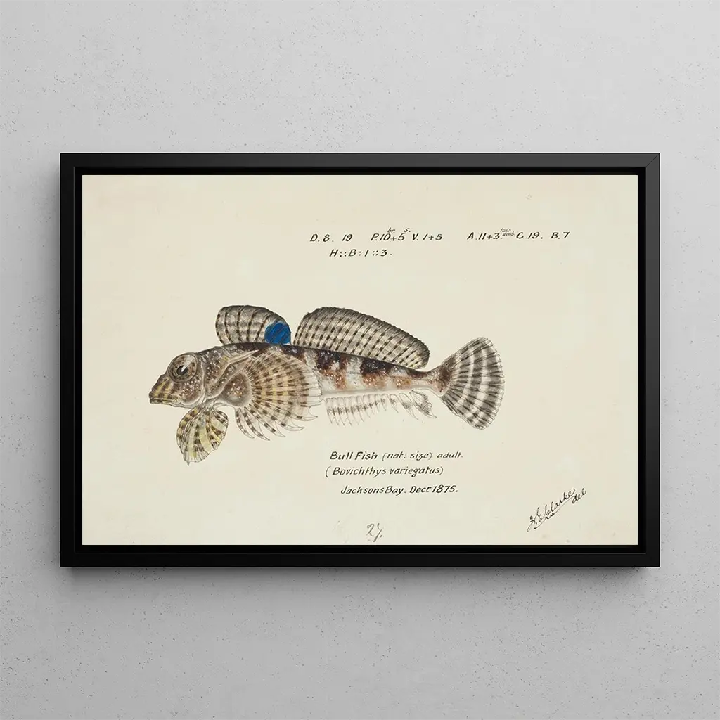 De Bovichtus variegatus, iconische steurvis uit Nieuw-Zeeland, wordt met opmerkelijke precisie weergegeven in deze kunstdruk. De levendige tinten blauw en groen van zijn lichaam contrasteren met de donkerdere tinten van zijn onderwaterhabitat. De techniek van Frank Edward Clarke, die realisme combineert met minutieuze details, stelt je in staat de schoonheid en complexiteit van deze unieke vis te vangen. Elke glanzende schub lijkt bijna levend, en nodigt de kijker uit om onder te dompelen in een fascinerende waterwereld.