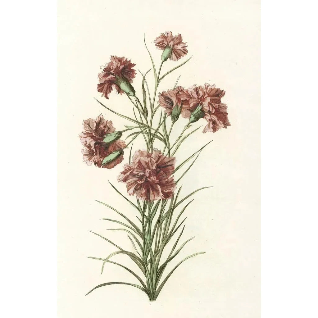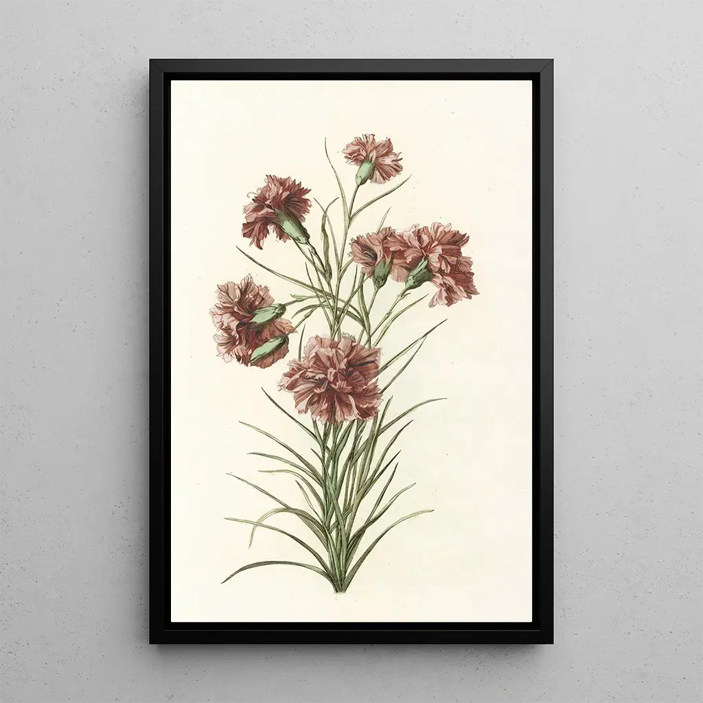 De kunstdruk van de Branche met zes anjers biedt een poëtische visie op de natuur, waarbij elke bloem wordt benadrukt met opmerkelijke precisie. De pastelkleuren, zacht en rustgevend, creëren een serene sfeer, terwijl de evenwichtige compositie de aandacht naar de bloemdetails trekt. De techniek, waarschijnlijk geïnspireerd door inkttekeningen, maakt het mogelijk de lichtheid en de fragiele aard van de bloemblaadjes weer te geven. Dit werk roept een rustige contemplatie op en nodigt de kijker uit om de vergankelijke schoonheid van de natuur te waarderen.