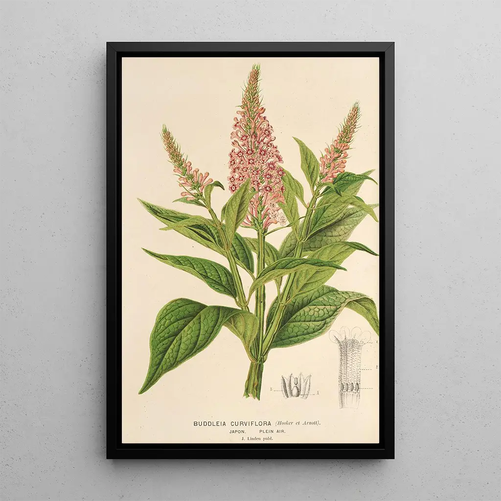 De kunstdruk van Buddleia curviflora is een viering van de uitbundige bloei, waarbij de paarse en witte tinten samensmelten tot een visueel betoverend schouwspel. De details van de bloemen, met uiterste precisie weergegeven, roepen de lichtheid en gratie van deze plant op. De sfeer van dit kunstwerk is zowel vrolijk als rustgevend, uitnodigend tot contemplatie en verwondering. Elk element van de compositie lijkt te vibreren van energie, waardoor dit doek een ware ode is aan de natuurlijke schoonheid.
