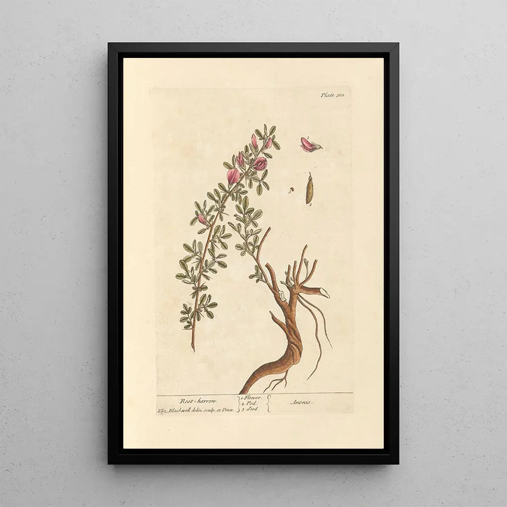 De kunstdruk Bugrane van Elizabeth Blackwell is een ware viering van de bloemrijke schoonheid. Dit werk, uitgevoerd met botanische precisie, benadrukt de delicate nuances van de bloemblaadjes en bladeren, en creëert een rustgevende sfeer. De pastelkleuren, variërend van zachte groen tot subtiel roze, roepen de zachtheid van de lente op. De aquareltechniek laat het licht spelen op de oppervlakken, waardoor elk detail tot leven komt. De kunstenaar slaagt erin de essentie van de plant vast te leggen, en nodigt de kijker uit tot een sereen meditatief moment en waardering voor de natuur.