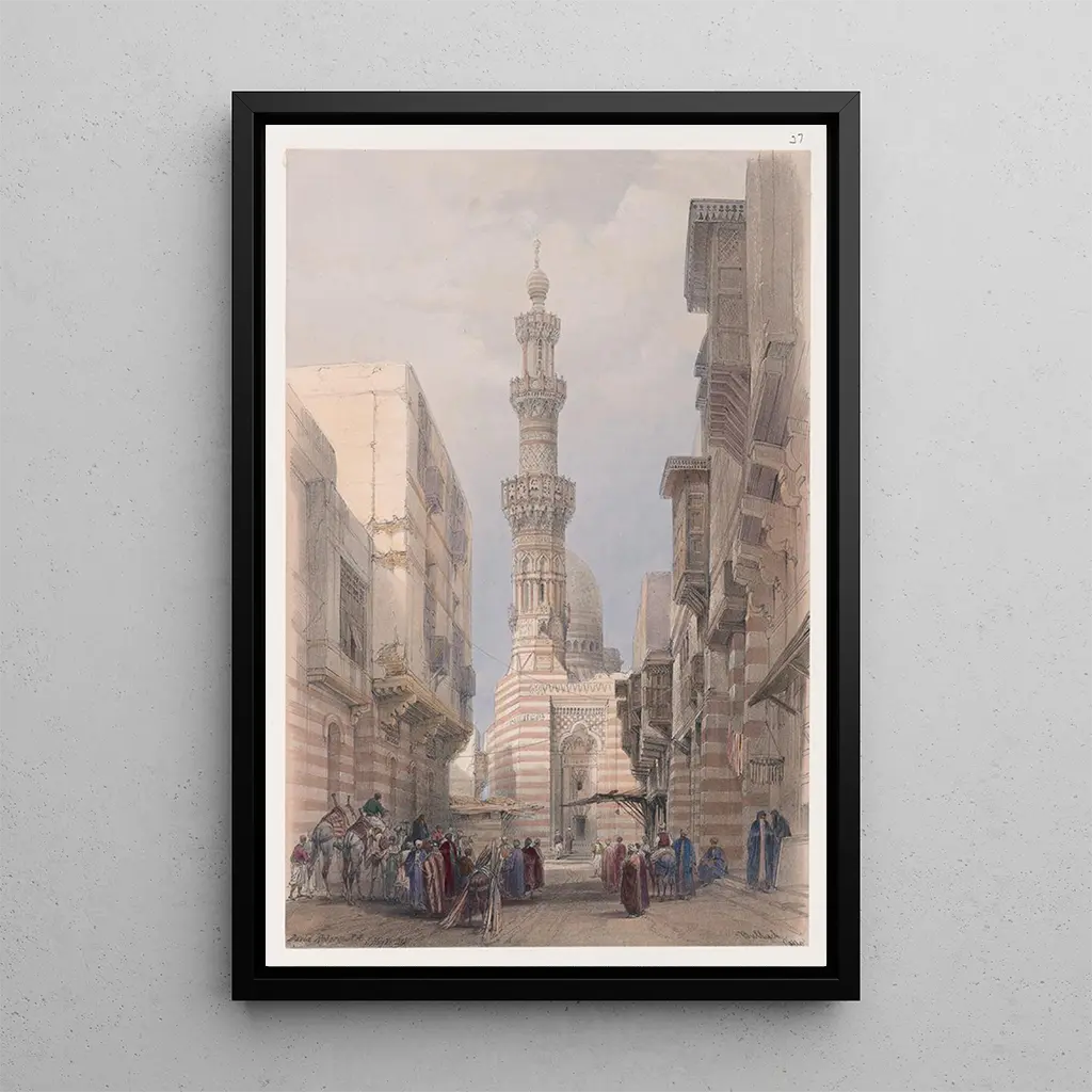 La kunstdruk du tableau "Bullack Le Caire" de David Roberts nous transporte au cœur d'une scène de vie quotidienne au Caire. Les personnages, habillés de vêtements traditionnels, se mêlent aux ânes chargés de marchandises, créant une dynamique vivante et colorée. Les teintes terreuses et les ombres délicates donnent une profondeur à l'œuvre, tandis que la technique de la peinture à l'huile permet de capturer les détails minutieux des visages et des expressions. Cette toile évoque non seulement un moment figé dans le temps, mais aussi l'âme d'une ville où chaque coin de rue raconte une histoire.