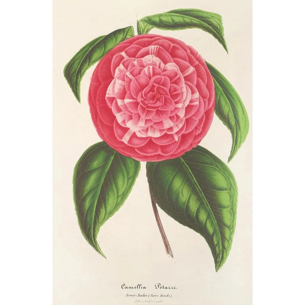 De kunstdruk Camellia Petazzi van Charles Antoine Lemaire is een viering van de bloemrijke schoonheid, waarbij elke tint harmonieus samenkomt. Dit schilderij benadrukt de camellia Petazzi, een variëteit met delicate bloemblaadjes en levendige nuances van roze en wit. De techniek van Lemaire, gekenmerkt door precieze penseelstreken en een minutieuze aandacht voor details, creëert een levendige en dynamische sfeer. Het werk lijkt bijna tot leven te komen en nodigt de kijker uit om onder te dompelen in een weelderig bloemrijk universum, waar de natuur in al haar pracht tot uiting komt.