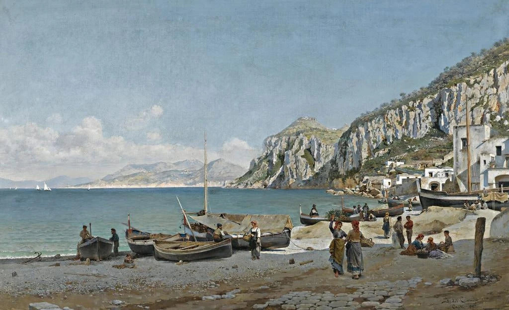 Federico del Campo, 19e-eeuwse schilder, is erkend om zijn zeelandschappen en natuurscènes, vooral die van Italië. Geïnspireerd door de romantische beweging, wist hij de schoonheid van landschappen vast te leggen met een unieke gevoeligheid. Zijn werken, vaak doordrenkt met een poëtische sfeer, getuigen van zijn liefde voor de natuur en de reizen die hij heeft ondernomen. "Capri" is een emblematisch voorbeeld van zijn stijl, waarin licht en kleur samensmelten om composities te creëren die zowel realistisch als geïdealiseerd zijn, en de schoonheid van de natuurlijke wereld vieren.