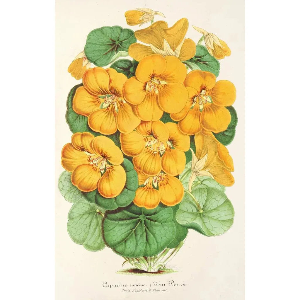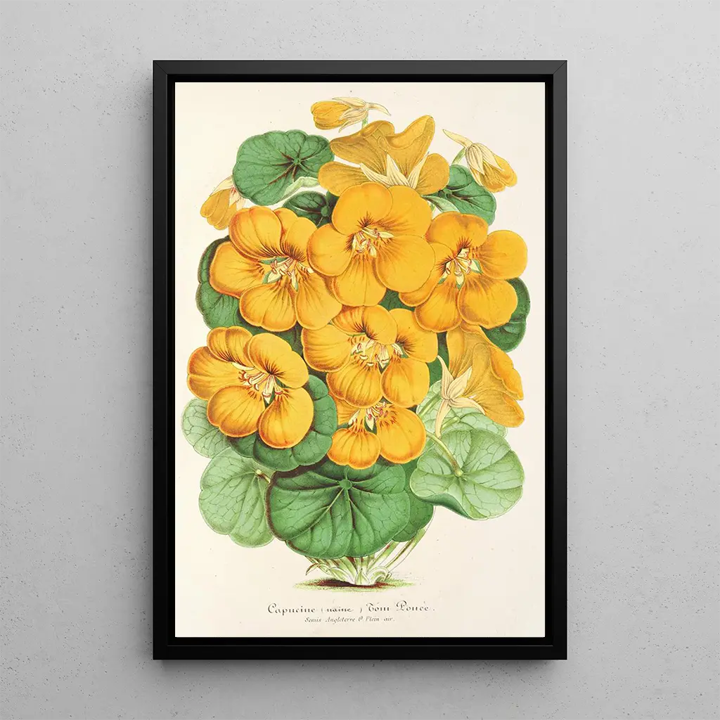 De kunstdruk van Capucine Tom Pouce, een werk van Charles Antoine Lemaire, dompelt ons onder in een wereld waar de natuur zich met gratie ontvouwt. De pastelkleuren van de bloemblaadjes, gecombineerd met hints van zachte groen, creëren een zachte en rustgevende sfeer. Lemaire, met zijn minutieuze techniek, slaagt erin de lichtheid en de fragiele schoonheid van deze iconische bloem vast te leggen. Elk detail, van de nerven van de bladeren tot de lichtreflecties op de bloemblaadjes, wordt zorgvuldig weergegeven, wat de kijker uitnodigt tot een aandachtige contemplatie. Dit doek roept een gevoel van sereniteit op, als een frisse bries in een geheime tuin.