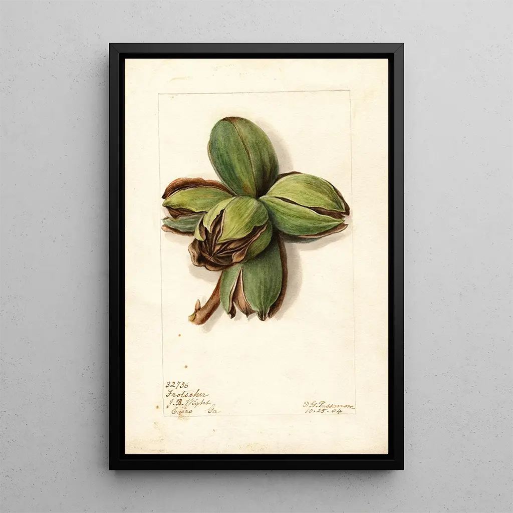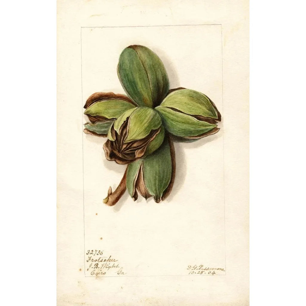 De kunstdruk Carya Frotscher van Deborah Griscom Passmore is een viering van natuurlijke schoonheid, waarbij de nuances van groen worden gecombineerd met accenten van bruin en goud. Dit werk, vervaardigd met een verfijnde aquareltechniek, roept de majesteit van de bomen en de rijkdom van de flora op. Elke tak, elk blad wordt zo delicaat weergegeven dat het lijkt te vibreren onder de adem van de wind. De algemene sfeer van het doek nodigt uit tot een rustige contemplatie, en brengt de kijker naar een weelderige tuin vol leven en kleuren.