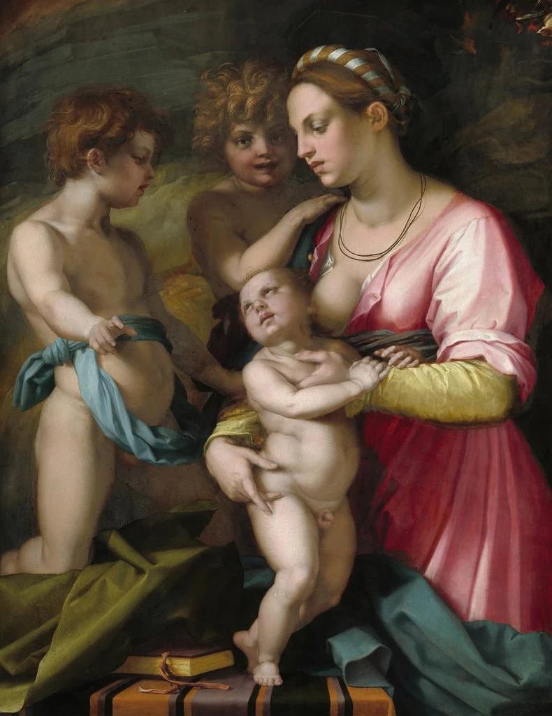 De technische meesterschap van Andrea del Sarto komt tot uiting in elk detail van de compositie. De delicate kleuren, zorgvuldig gekozen, creëren een visuele harmonie die onmiddellijk de aandacht trekt. Het licht, alomtegenwoordig, speelt een cruciale rol door de gezichten van de personages te verlichten en tegelijkertijd schaduwen te werpen die een dimensie van diepte toevoegen. De houding van de figuren, zowel sierlijk als natuurlijk, getuigt van een diepgaand begrip van de menselijke anatomie, een aspect dat de kunstenaar gedurende zijn hele carrière heeft verfijnd. Bovendien getuigt de manier waarop de plooien worden weergegeven met zo'n vloeiendheid en lichtheid van het ongeëvenaarde talent van Andrea del Sarto om beweging en textuur vast te leggen. Dit werk onderscheidt zich niet alleen door zijn esthetische schoonheid, maar ook door de narratieve kracht die uit de interacties tussen de personages voortkomt.