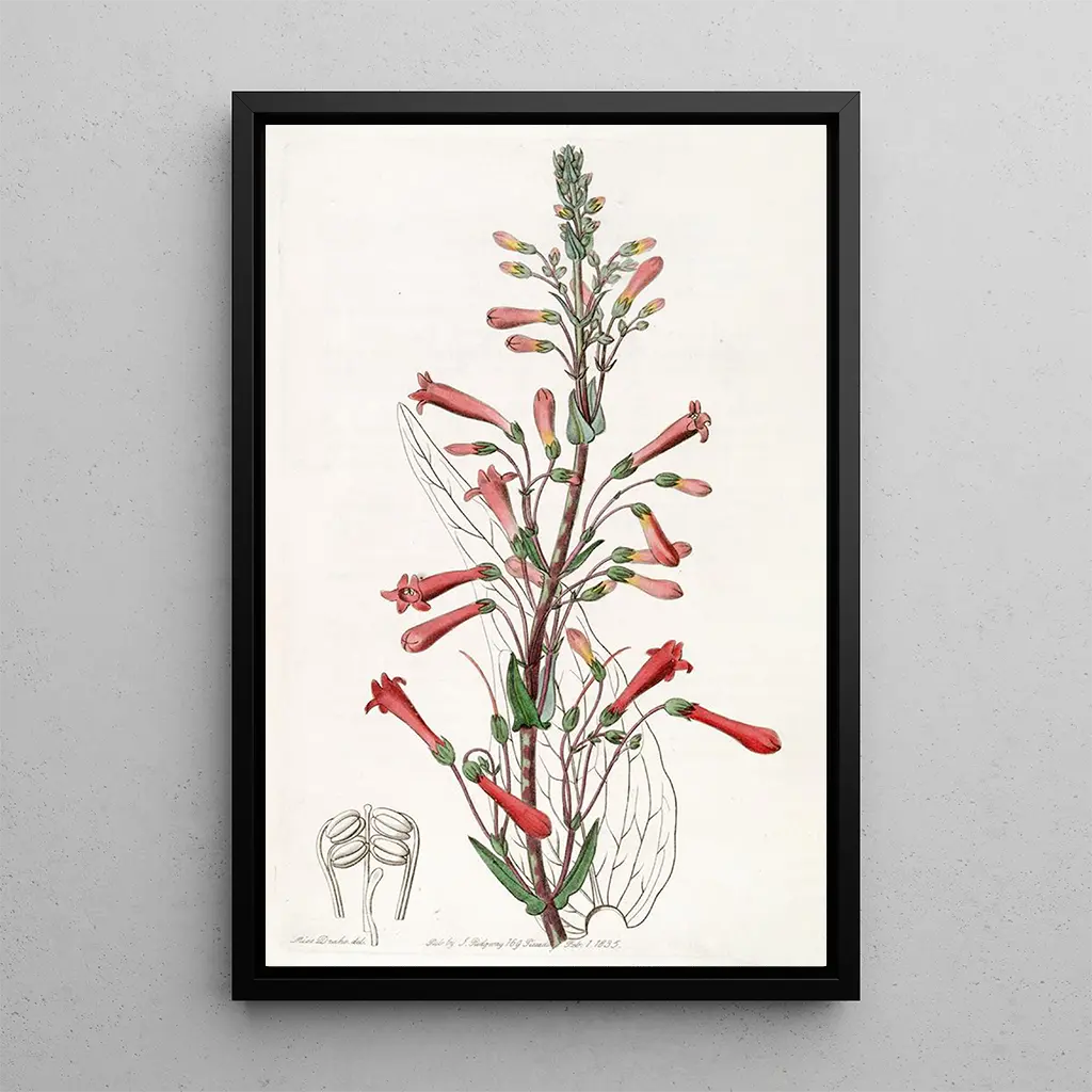 La kunstdruk de la Chelone à feuilles de valériane, œuvre de Sydenham Edwards, nous plonge dans un univers botanique où la précision des détails se marie à une palette de couleurs vibrantes. Les nuances de vert et de rose s’entrelacent, créant une atmosphère apaisante et vivifiante. La technique de l’aquarelle, maîtrisée par Edwards, permet de capturer la légèreté des pétales et la texture des feuilles, offrant une représentation fidèle de cette plante. Chaque élément est soigneusement mis en valeur, invitant le spectateur à une contemplation attentive et à une appréciation de la beauté naturelle.