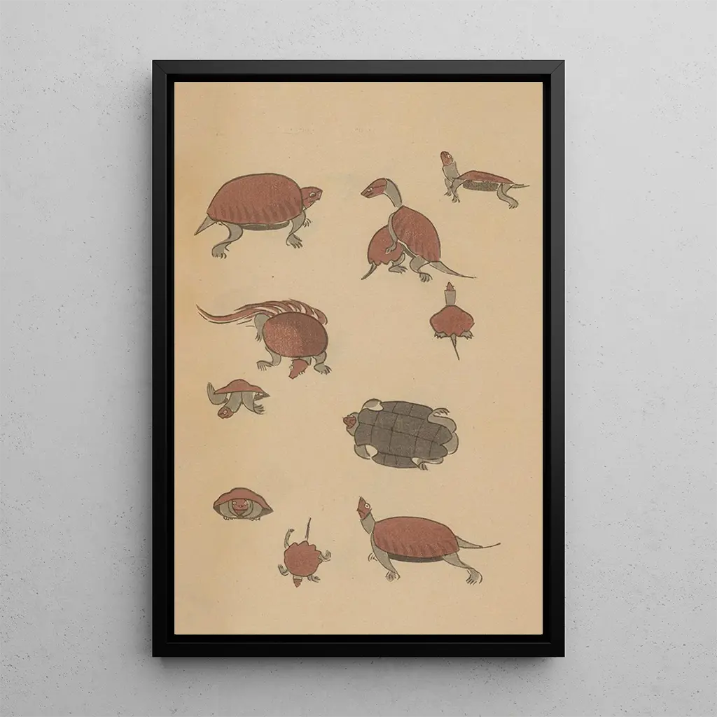 De kunstdruk Choju ryakugashiki Pl39 van Masayoshi Kitao roept een delicate harmonie op tussen de natuur en kunst. De levendige kleuren en vloeiende lijnen vermengen zich om een scène te creëren waarin fauna en flora in een visueel ballet verweven zijn. De techniek van de Japanse houtsnede, met zijn minutieuze details en subtiele nuances, biedt een rustgevende, bijna meditatieve sfeer. Elk element van de compositie lijkt een verhaal te vertellen, en nodigt de kijker uit om onder te dompelen in een wereld waar natuurlijke schoonheid gevierd wordt.