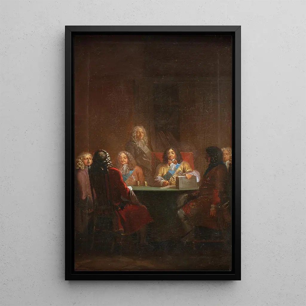 De kunstdruk van het werk "Christian V presenteert de Deense wet 1683" van Nicolai Abildgaard dompelt ons onder in een levendige historische scène. De rijke kleuren en de minutieuze details van dit doek roepen een plechtige sfeer op, waarin elk personage lijkt te dragen de last van de geschiedenis. De kunstenaar gebruikt een palet van aardetinten, versterkt door gouden accenten, om deze gedenkwaardige ceremonie tot leven te brengen. De compositie, zorgvuldig georkestreerd, benadrukt koning Christian V, omringd door edelen en adviseurs, allemaal vastgelegd in een moment van ernst en respect.