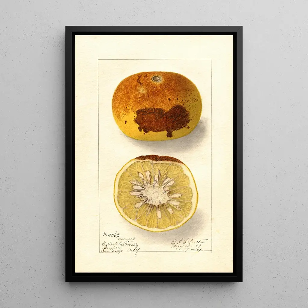 Ellen Isham Schutt, actief aan het einde van de 19e eeuw en het begin van de 20e eeuw, wordt erkend om haar werk in de botanische kunst. Geïnspireerd door de naturalistische beweging, wist ze de schoonheid van planten en vruchten met opmerkelijke precisie vast te leggen. Haar kunstwerk onderscheidt zich door aandacht voor detail en een wetenschappelijke benadering, terwijl het toch een esthetische dimensie behoudt. Schutt heeft bijgedragen aan de popularisering van de botanische kunst als een vorm van artistieke expressie, en haar creaties blijven kunstenaars en natuurliefhebbers inspireren. Haar passie voor citrusvruchten, vooral, wordt benadrukt in deze kunstdruk.
