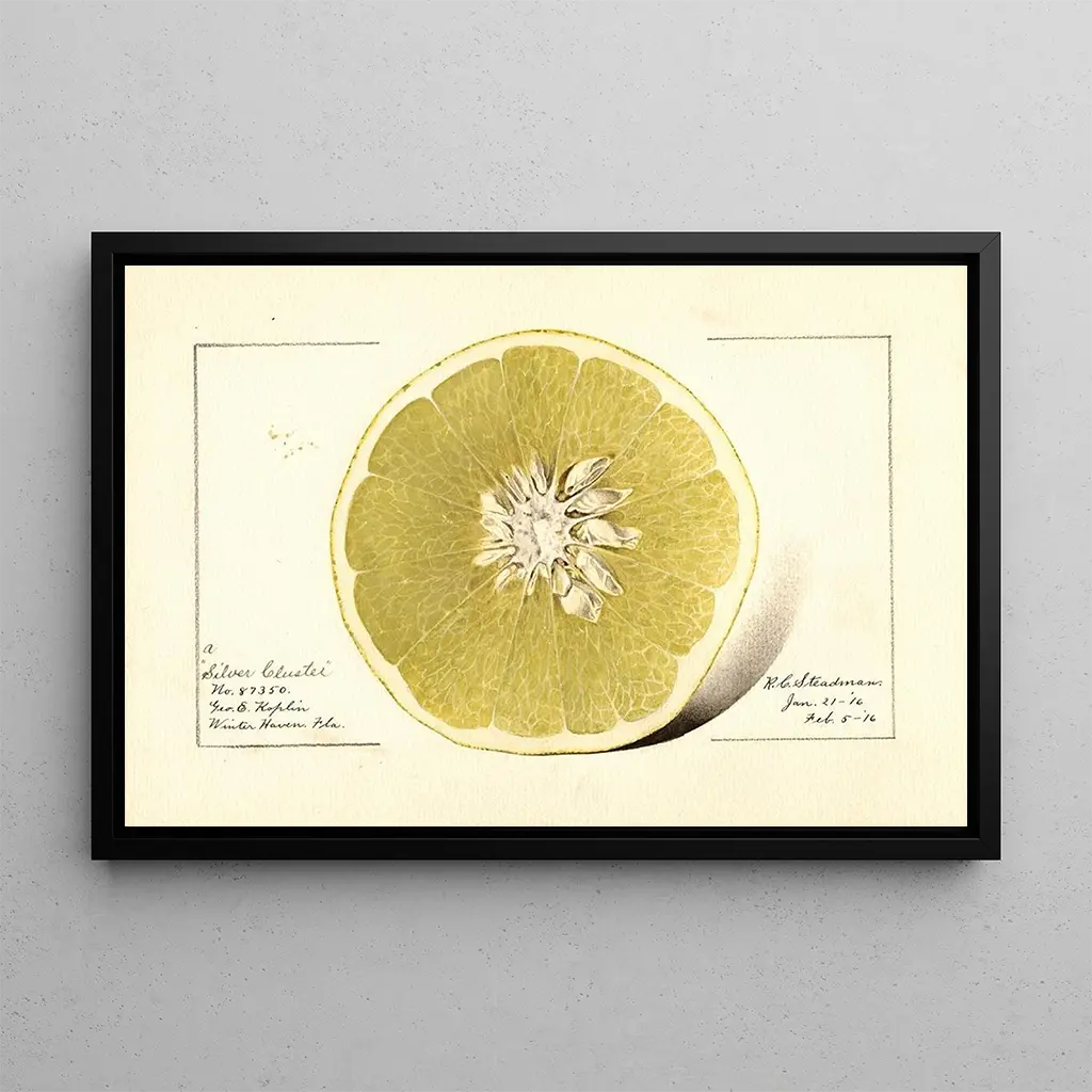Citrus paradisi Silver Cluster : een explosie van fruitige kleuren De kunstdruk van Citrus paradisi Silver Cluster dompelt ons onder in een levendige wereld waar nuances van geel, groen en wit zich verweven om een speelse compositie te creëren. Het schilderij roept de frisheid van citrusvruchten op, met sappige vruchten die bijna voelbaar lijken. De techniek van de kunstenaar, die aquarel en olie combineert, geeft het werk een lichte uitstraling, terwijl het natuurlijke licht de reflecties en schaduwen benadrukt. De sfeer die van dit doek uitgaat, is zowel vrolijk als rustgevend, en nodigt de kijker uit om te genieten van de eenvoudige schoonheid van de natuur. Royal Charles Steadman : een meester in botanisch realisme Royal Charles Steadman, actief aan het einde van de 19e eeuw, wordt erkend om zijn werken die de schoonheid van de natuurlijke wereld vieren. Geïnspireerd door de stroming van het realisme, specialiseerde hij zich in de nauwkeurige weergave van planten en vruchten, waarbij hij hun essentie vastlegt met opmerkelijke precisie. Zijn werken, vaak geïnspireerd door botanica, getuigen van een diep respect voor de natuur en een wens om deze te behouden door middel van kunst. Steadman wist esthetiek en wetenschap te combineren, waardoor zijn schilderijen referenties zijn in het veld van bloemkunst. Een decoratieve aanwinst met vele voordelen De kunstdruk van Citrus paradisi Silver Cluster is een ideale keuze om je interieur te verfraaien, of het nu in een woonkamer, kantoor of slaapkamer is. Het heldere palet en de verfijnde details brengen een vleugje frisheid en vitaliteit in elke ruimte. De kwaliteit van de afdruk garandeert trouw aan het originele werk, zodat je dagelijks kunt genieten van de esthetische aantrekkingskracht. Door dit doek in je decoratie te integreren, geef je je omgeving een vleugje elegantie en natuur, terwijl je de bewondering van je gasten wekt.
