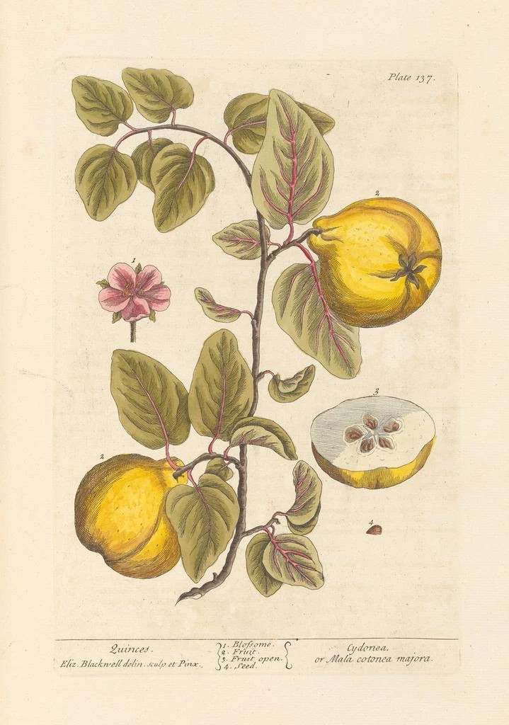 In deze kunstdruk van Coings nodigt Elizabeth Blackwell ons uit om onder te dompelen in een rijke en delicate botanische wereld. De compositie benadrukt rijpe vruchten, met gouden en groene tinten, zorgvuldig geplaatst op een neutrale achtergrond die hun glans versterkt. De gravuretechniek, gecombineerd met een palet van zachte kleuren, creëert een rustgevende en contemplatieve sfeer. Elk detail, van texturen tot schaduwen, getuigt van een minutieuze vakmanschap, en eert de eenvoudige schoonheid van de natuur. Dit werk, zowel wetenschappelijk als artistiek, herinnert ons aan het belang van observatie en waardering van de wonderen van de plantwereld.