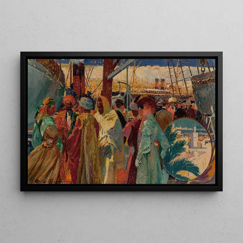Compagnie Transatlantique Algérie-Tunisie : een reis door de tijd Compagnie Transatlantique Algérie-Tunisie, een kunstdruk van David Dellepiane, roept een nostalgische reis over de zeeën op. Dit schilderij, rijk aan details, beeldt een levendige maritieme scène uit, waar schepen naast elkaar varen in een bruisend decor. De sprankelende kleuren, variërend van diepe blauwen tot warme okers, creëren een sfeer die zowel dynamisch als gastvrij is. Dellepiane, met zijn beheersing van licht en schaduw, slaagt erin de essentie van het tijdperk van grote zeereizen vast te leggen, en nodigt de kijker uit om zich onder te dompelen in dit avontuur. David Dellepiane : een getuige van het maritieme tijdperk David Dellepiane, kunstenaar uit de 19e eeuw, staat bekend om zijn werken die het maritieme leven en reizen vieren. Geïnspireerd door de romantische beweging, wist hij de majesteit van schepen en de schoonheid van zeegezichten te vangen. Zijn werk valt in een periode waarin maritiem vervoer in volle bloei was, en symbool stond voor ontdekking en culturele uitwisseling. Compagnie Transatlantique Algérie-Tunisie weerspiegelt deze periode van welvaart en verkenning, terwijl het artistieke vakmanschap van Dellepiane wordt benadrukt, die deze vluchtige momenten wist te vereeuwigen. Een decoratieve kunstdruk met vele voordelen De kunstdruk van Compagnie Transatlantique Algérie-Tunisie is een ideale keuze om uw woonruimte te verfraaien. Of het nu in een woonkamer, kantoor of slaapkamer is, dit doek brengt een vleugje elegantie en karakter. De afdrukkwaliteit garandeert een nauwkeurige weergave van de kleuren en details van het originele werk, zodat u kunt genieten van de betoverende sfeer. Met zijn esthetische aantrekkingskracht en verhaal is deze kunstdruk veel meer dan een gewoon schilderij; het is een uitnodiging om door tijd en ruimte te reizen.