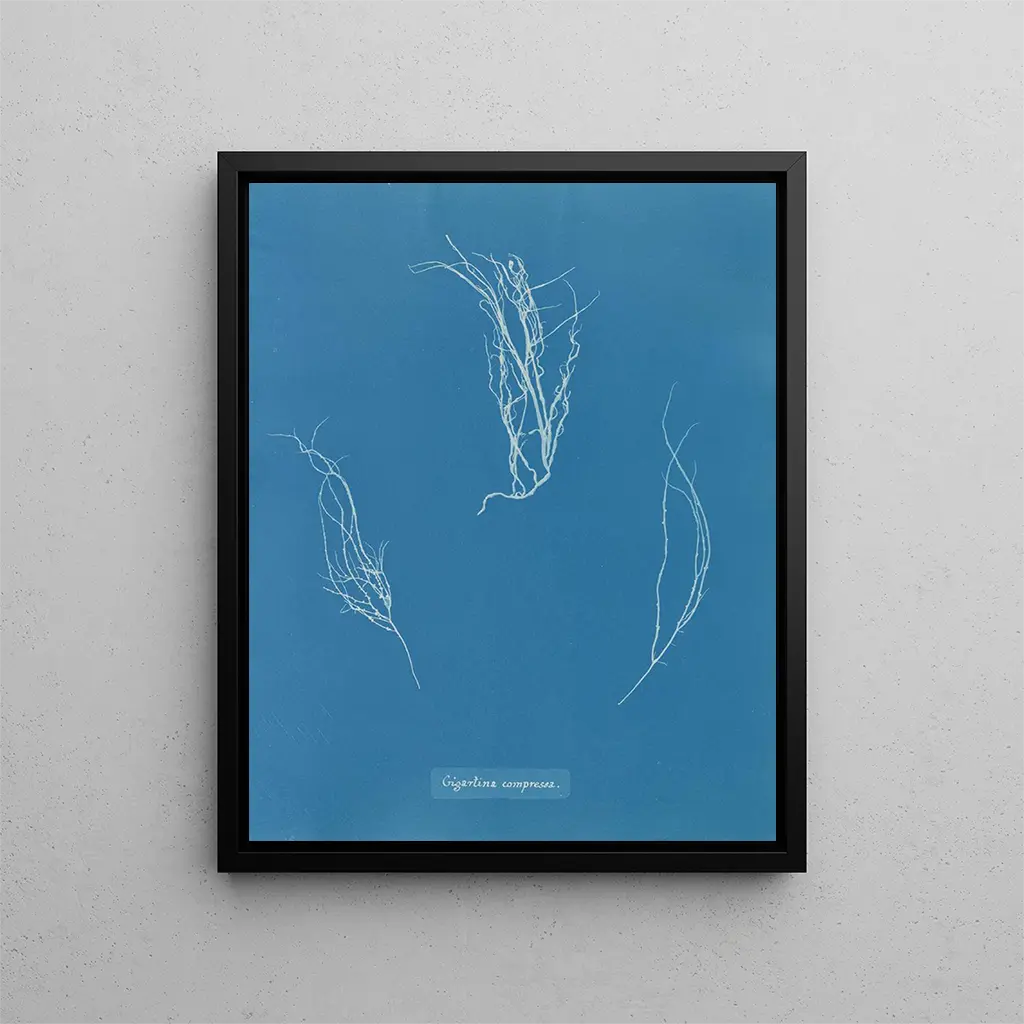 Reproductie Kunstdruk Comprimé Gigartina - Anna Atkins – Boeiende introductie De kunstdruk Comprimé Gigartina - Anna Atkins is een iconisch werk dat de essentie van de botanische fotografie uit de 19e eeuw belichaamt. Anna Atkins, pionier in haar vakgebied, wist de schoonheid van zeewieren vast te leggen met een precisie en verfijning die verder gaan dan louter documentatie. In een wereld waarin de natuur vaak wordt bekeken door de lens van moderne technologie, nodigt dit werk ons uit om de magie van organische vormen en subtiele texturen opnieuw te ontdekken. Door haar werk heeft Atkins niet alleen de weg geëffend voor een nieuwe kunstvorm, maar ook de diversiteit en complexiteit van de natuurlijke wereld gevierd, en ons aangezet tot het contempleren van de schoonheid die ons omringt. Stijl en uniekheid van het werk De stijl van Comprimé Gigartina onderscheidt zich door haar unieke benadering van fotografie. Gebruikmakend van de cyanotypetechniek, heeft Atkins indrukken gecreëerd met een opmerkelijke diepte en helderheid, waarbij de nuances van blauw harmonieus samensmelten met de delicate silhouetten van zeewieren. Elk detail wordt zorgvuldig weergegeven, waarbij de aders en contouren van de zeewieren met indrukwekkende fideliteit worden onthuld. Deze technische keuze, zowel vernieuwend als esthetisch, geeft het werk een bijna dromerige sfeer, waarin wetenschap en kunst in een subtiele dans versmelten. De compositie, zowel eenvoudig als verfijnd, stelt het oog in staat zich te richten op de vormen, waardoor een intieme verbinding ontstaat tussen de waarnemer en de natuur. Daarmee is Comprimé Gigartina meer dan een eenvoudige voorstelling; het is een uitnodiging om de mysteries van het zeeleven te verkennen. De kunstenaar en haar invloed Anna Atkins, vaak beschouwd als de eerste vrouwelijke fotograaf, markeerde haar tijdperk met haar durf en visie. Geboren in 1799, werd ze beïnvloed door de wetenschappelijke ontdekkingen van haar tijd, vooral op het gebied van de botanica. Haar werk, dat wetenschappelijke nauwkeurigheid combineert met artistieke gevoeligheid, heeft de weg geëffend voor vele generaties kunstenaars en wetenschappers. Door fotografie te integreren in de wetenschap, heeft Atkins de grenzen van de kunst herdefinieerd, en bewezen dat schoonheid kan liggen in precisie en documentatie. Haar invloed is nog steeds voelbaar, zowel in het vakgebied