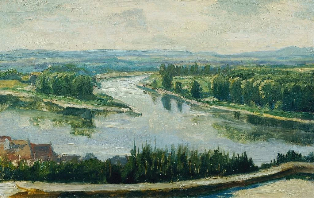 Het doek "Confluence van de Moldau en de Elbe" van Ferdinand Engelmüller dompelt ons onder in een idyllisch landschap waar de rivieren samenkomen in een delicate dans. De zachte kleuren en de nuances van groen roepen de sereniteit op van een ongerepte natuur, terwijl de blauwe accenten van de rivieren een verfrissende vitaliteit brengen. De techniek van de kunstenaar, die realisme en impressionisme combineert, creëert een rustige, bijna contemplatieve sfeer. De minutieuze details van de bomen en de heuvels nodigen uit om elk hoekje van deze landelijke scène te verkennen, waar de hemel weerspiegeld wordt in het kalme water en de harmonie tussen mens en omgeving symboliseert.