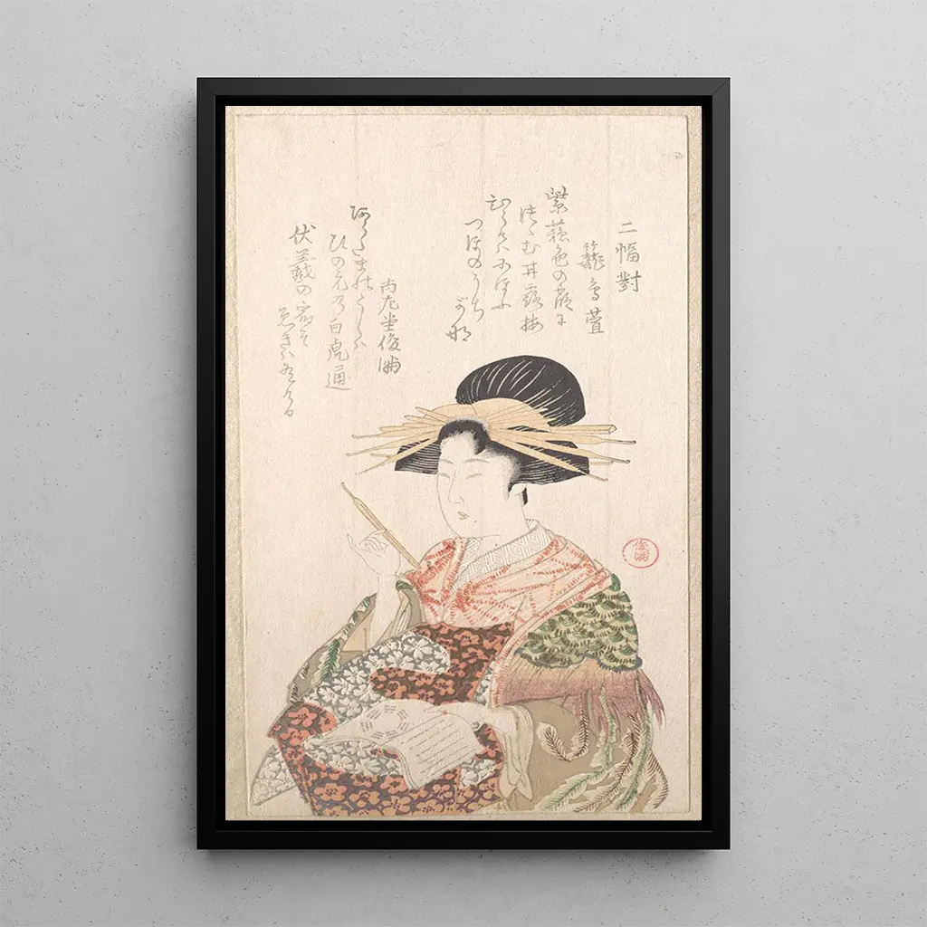 Dans la kunstdruk de "Courtisane avec livre et épingle à cheveux", Kubo Shunman capture une scène empreinte de grâce et de mystère. La courtisane, délicatement posée, tient un livre qui semble receler des secrets et des histoires. Les couleurs vives et les motifs raffinés de son costume attirent le regard, tandis que l'éclat de l'épingle à cheveux ajoute une touche de sophistication. La technique de l'estampe, avec ses détails minutieux, permet de ressentir l'atmosphère intimiste et poétique de cette œuvre. Cette représentation met en lumière la beauté et l'intellect des femmes de l'époque, tout en offrant une fenêtre sur un monde révolu.