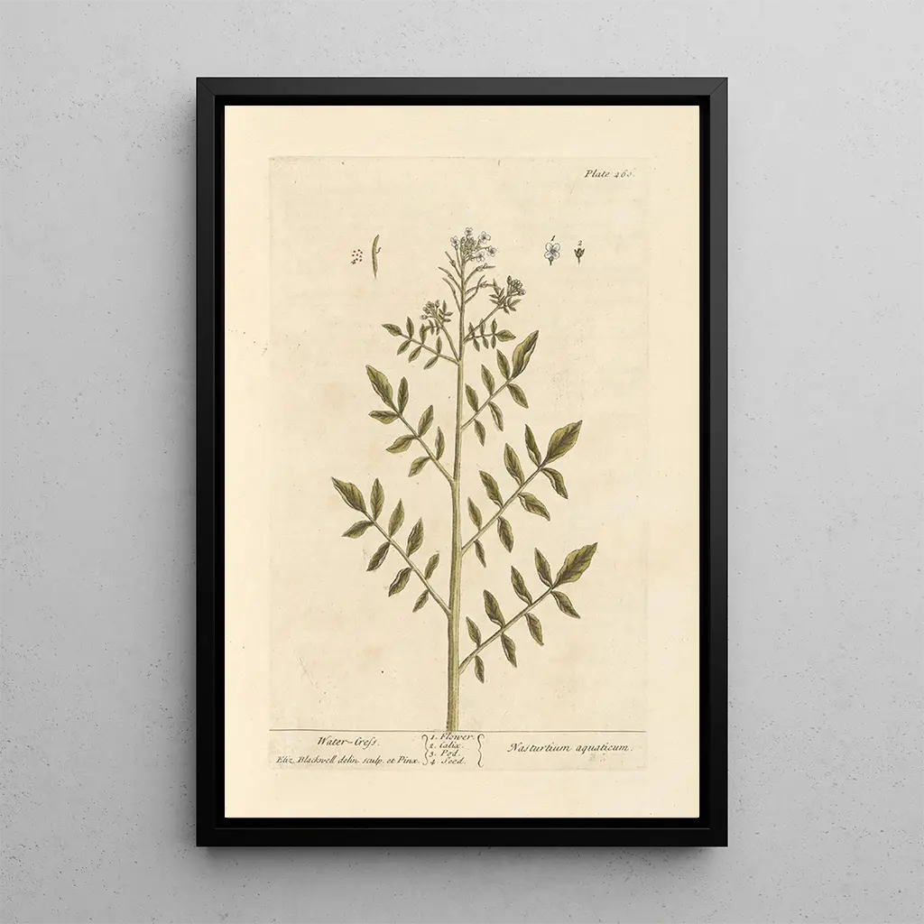 Cresson : een ode aan de delicate natuur In deze kunstdruk van de Cresson brengt Elizabeth Blackwell ons naar het hart van een levendige en delicate natuur. Het doek onderscheidt zich door zijn tinten groen, die de frisheid van rivieren en tuinen oproepen. De minutieuze details van de bladeren en bloemen getuigen van een aandachtige observatie en een verfijnde graveertechniek. De sfeer die uit dit werk straalt, is rustgevend en nodigt de kijker uit om de eenvoudige maar essentiële schoonheid van deze waterplant te waarderen. Elk element is zorgvuldig gerangschikt, waardoor een harmonieuze compositie ontstaat die de rijkdom van de flora viert. Elizabeth Blackwell : pionier in botanische illustratie Elizabeth Blackwell, actief in de achttiende eeuw, is een iconische figuur in de botanische illustratie. Geboren in 1707, wist ze kunst en wetenschap te combineren en werd ze de eerste vrouw die een boek met botanische kunstdrukken publiceerde in Engeland. Haar werk bevindt zich in een periode waarin de studie van planten in volle bloei was, beïnvloed door de wetenschappelijke ontdekkingen van haar tijd. Blackwell was geïnspireerd door botanici zoals Carl Linnaeus, en haar minutieuze aanpak heeft bijgedragen aan het eren van de schoonheid en diversiteit van de plantwereld. Haar nalatenschap blijft bestaan, waardoor ze een pionier in haar vakgebied is. Een decoratieve aanwinst met vele voordelen Kiezen voor een kunstdruk van de Cresson van Elizabeth Blackwell betekent kiezen voor een kunstwerk dat je interieur verfraait en tegelijkertijd een vleugje natuur brengt. Of het nu in een woonkamer, kantoor of slaapkamer is, dit doek past harmonieus in diverse decoratiestijlen. De afdrukkwaliteit garandeert een trouwheid aan de originele details, waardoor je de delicate schoonheid van het werk kunt ervaren. Met zijn onmiskenbare esthetische aantrekkingskracht wordt deze kunstdruk een blikvanger die nieuwsgierigheid en bewondering opwekt bij je gasten, terwijl het een serene en inspirerende sfeer toevoegt aan je leefruimte.