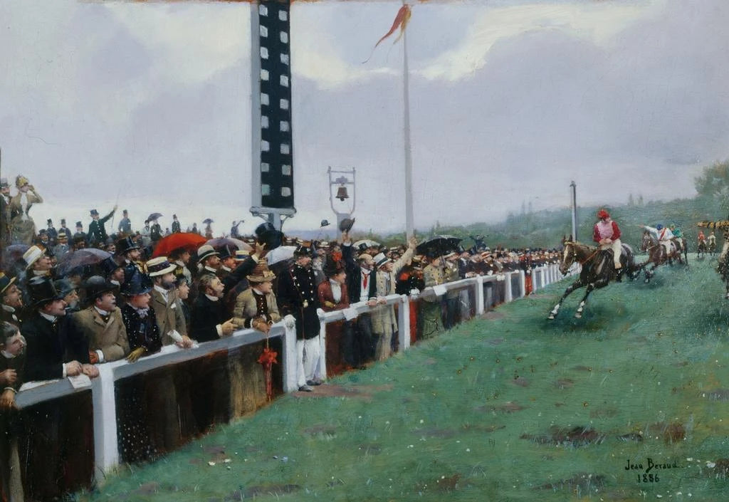 De kunstdruk Courses à Longchamp, l'Arrivée au Poteau van Jean Béraud vangt op meesterlijke wijze de opwinding van een paardenrace. De heldere kleuren en de dynamische bewegingen van jockeys en paarden creëren een opzwepende sfeer. Béraud, met zijn impressionistische stijl, gebruikt snelle penseelstreken om het beslissende moment vast te leggen waarop de paarden de finishlijn passeren. De toeschouwers op de achtergrond voegen een menselijke dimensie toe aan deze scène, en getuigen van de volksgeest voor de races. Dit kunstwerk roept niet alleen de competitie op, maar ook de elegantie van de paardenraces aan het eind van de 19e eeuw.