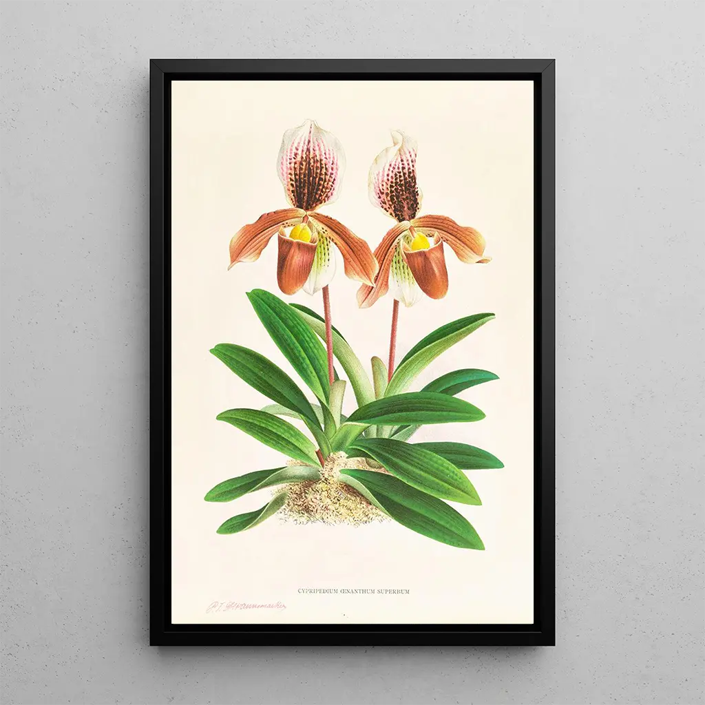 De kunstdruk van Cypripedium oenanthum superbum brengt ons in een weelderige tuin, waar de levendige kleuren van orchideeën bloeien onder een heldere hemel. Jean Jules Linden, met zijn ongeëvenaarde talent, slaagt erin de pracht van deze zeldzame bloem vast te leggen. De tinten geel en rood verweven zich, en roepen de warmte van de zon en de rijkdom van de aarde op. De delicate aquareltechniek geeft dit kunstwerk een lichtheid en vloeiendheid, alsof de bloemen klaar zijn om mee te waaien met de wind.