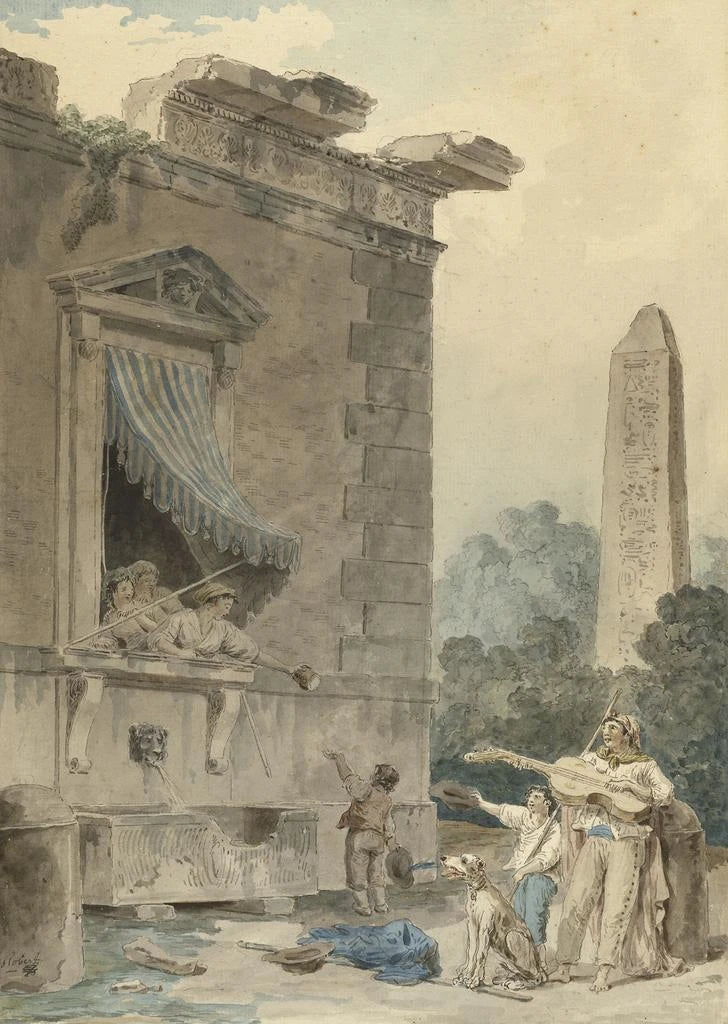Né en 1733 à Paris, Hubert Robert est un peintre français reconnu pour ses paysages et ses scènes de genre. Influencé par le mouvement rococo, il développe un style unique qui allie rêve et réalité. Sa carrière prend un tournant décisif lorsqu'il voyage en Italie, où il s'imprègne des œuvres des grands maîtres et de l'architecture classique. Robert devient rapidement un artiste de cour, apprécié pour ses représentations de jardins et de ruines. Son œuvre, riche en détails et en émotions, témoigne de l'importance de la nature et de l'humanité, faisant de lui une figure emblématique du XVIIIe siècle.