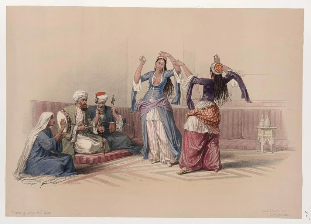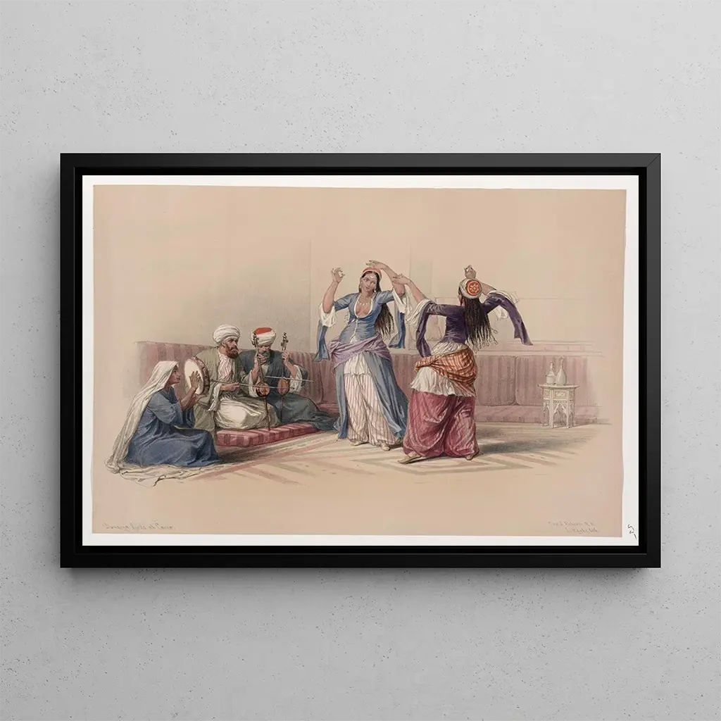"Danseurs au Caire" van David Roberts is een kunstdruk die de schoonheid en elegantie van oosterse dansers oproept, en een moment van gratie en beweging vastlegt. De vrouwelijke figuren, gekleed in kleurrijke kostuums, lijken te dansen op het ritme van een onhoorbare muziek, terwijl de architectonische achtergrond de exotiek van Caïro weerspiegelt. Roberts' techniek, die realisme en romantiek combineert, creëert een sfeer die zowel levendig als dromerig is, en de kijker meeneemt naar een verre en fascinerende wereld.