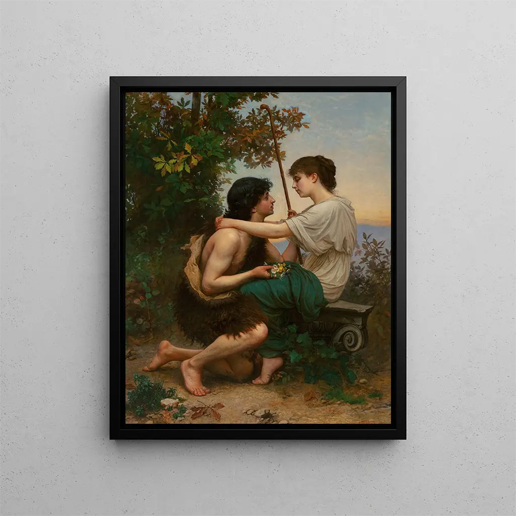 Reproductie Daphnis en Chloé - Camille Félix Bellanger – Boeiende introductie In de wereld van kunst overstijgen sommige werken het eenvoudige kader van schilderkunst en worden ze visuele verhalen vol emotie en poëzie. "Daphnis en Chloé" van Camille Félix Bellanger is hier een schitterend voorbeeld van. Dit werk, geïnspireerd door het mythologische liefdesverhaal tussen Daphnis en Chloé, roept de schoonheid van de natuur en de puurheid van gevoelens op. Door deze kunstdruk te bekijken, wordt de kijker onmiddellijk meegenomen naar een universum waar liefde en natuur verweven zijn, en dat een sfeer creëert die zowel sereen als betoverend is. De fijnheid van de lijnen en de rijkdom van de kleuren nodigen uit tot een diepe contemplatie, waardoor elke blik op het schilderij uniek en persoonlijk wordt. Stijl en uniekheid van het werk De stijl van Bellanger onderscheidt zich door een opmerkelijke fijnheid en een nauwgezette aandacht voor details. In "Daphnis en Chloé" worden de figuren weergegeven met een gracieuze en lichte uitstraling die bijna etherisch lijkt. De lichamen van de protagonisten, delicaat gemodelleerd, vloeien harmonieus samen in een weelderige omgeving waarin de natuur een centrale rol speelt. Het spel van licht en schaduw, evenals de subtiele nuances van de kleuren, creëren een intieme en romantische sfeer. Dit werk beperkt zich niet tot het weergeven van een scène; het vertelt een verhaal, dat van een onschuldige en gepassioneerde liefde die zich ontvouwt binnen een idyllisch landschap. Elk element van de compositie, van de bladeren tot de waterreflecties, draagt bij aan de algehele harmonie, waardoor dit stuk een waar meesterwerk uit de 19e eeuw is. De kunstenaar en zijn invloed Camille Félix Bellanger, Franse kunstenaar uit de 19e eeuw, wist zich te onderscheiden in het artistieke landschap van zijn tijd dankzij zijn onmiskenbare talent en zijn unieke visie. Geïnspireerd door romantiek en neoclassicisme, wist Bellanger traditie en innovatie te combineren, en werken te creëren die de essentie van menselijke emoties vastleggen. Zijn werk over "Daphnis en Chloé" getuigt van zijn vaardigheid om mythologische verhalen om te zetten in aangrijpende visuele representaties. De impact van Bellanger beperkt zich niet tot zijn tijd; zijn artistieke benadering blijft vele hedendaagse kunstenaars inspireren die op zoek zijn
