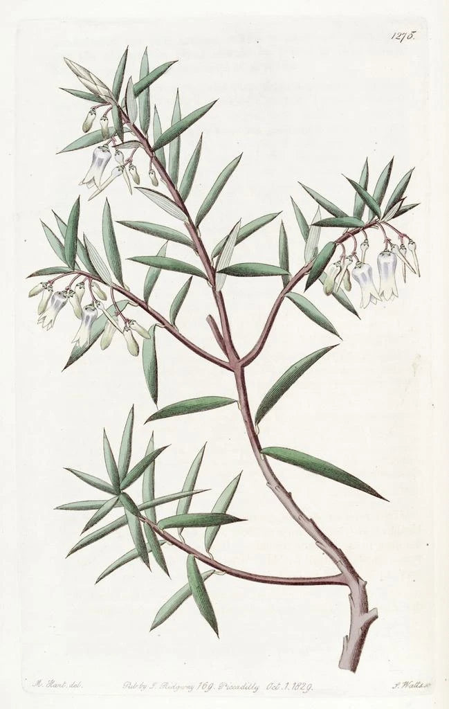 Sydenham Edwards, botanist en illustrator uit het begin van de 19e eeuw, heeft zijn tijd gekenmerkt door zijn bijdragen aan de botanische illustratie. Zijn werk onderscheidt zich door een nauwkeurige en wetenschappelijke aanpak, waarbij kunst een instrument wordt voor kennis. Geïnspireerd door de botanische verkenningen van zijn tijd, wist hij de diversiteit van planten vast te leggen met een scherp oog voor detail. De Australische veenbes is een perfect voorbeeld van zijn talent, dat esthetiek en precisie combineert en het belang van botanica in de kunst van die periode onderstreept.