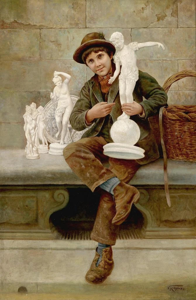 Vittorio Rignano, actief aan het einde van de 19e eeuw, is een Italiaanse kunstschilder wiens werk binnen de realistische beweging past. Zijn vermogen om het dagelijks leven met authenticiteit en gevoeligheid weer te geven, maakte hem tot een belangrijke figuur van zijn tijd. Geïnspireerd door de grote meesters uit het verleden, ontwikkelde Rignano een stijl die de details van het moderne leven benadrukt, terwijl hij het vakmanschap van traditioneel ambacht eert. Zijn werken, vaak gericht op marktscènes of ambacht, weerspiegelen een tijd waarin kunst en leven harmonieus verweven waren.