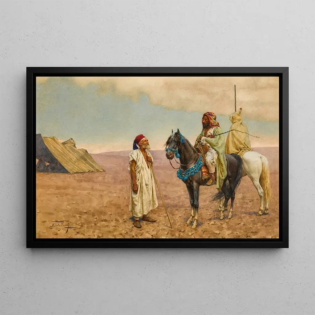 Giulio Rosati, Italiaanse schilder uit de 19e eeuw, wordt erkend om zijn werken die de essentie van oosterse culturen vastleggen. Geïnspireerd door zijn reizen in Noord-Afrika en het Midden-Oosten, wist hij de schoonheid en complexiteit van deze regio's te vertalen in zijn kunst. Actief voornamelijk tussen 1870 en 1900, maakt Rosati deel uit van de oosterse realistische beweging die vele kunstenaars van zijn tijd heeft gefascineerd. Zijn stijl, gekenmerkt door oog voor detail en een rijke palet, getuigt van een tijd waarin het Oosten werd gezien als een plek vol mysterie en exotisme, en een venster bood op verre werelden.
