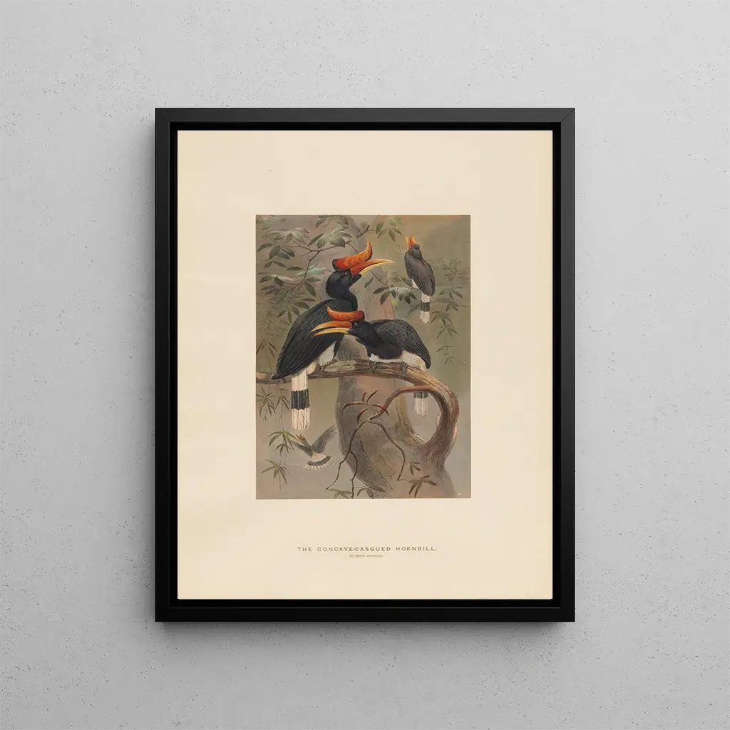 De Le Calao à casque concave, met zijn imposante snavel en schitterende verenkleed, wordt in deze levendige kunstdruk in de schijnwerpers gezet. Joseph Wolf slaagt erin niet alleen de fysieke schoonheid van deze vogel vast te leggen, maar ook zijn majestueuze karakter. De levendige kleuren, variërend van geel tot zwart, mengen harmonieus, waardoor een beeld ontstaat dat zowel dynamisch als rustgevend is. De techniek van Wolf, die precisie en gevoeligheid combineert, brengt deze fascinerende vogel tot leven en nodigt de kijker uit om onder te dompelen in zijn wereld. Elk detail, van de doordringende blik van de calaos tot de textuur van zijn veren, is een uitnodiging tot verwondering.