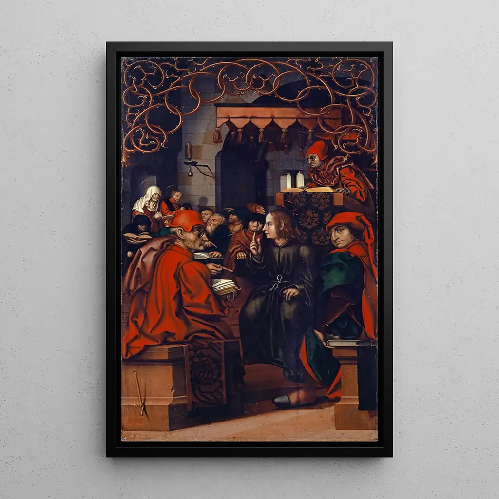 Hans Fries, actif à la fin du XVe siècle et au début du XVIe siècle, est un peintre flamand qui a su capturer l'esprit de son époque. Son style, à la croisée du gothique et de la Renaissance, reflète les changements culturels et religieux de son temps. Influencé par les œuvres de ses prédécesseurs, Fries a développé une approche unique, mettant l'accent sur la narration visuelle et l'expression des émotions. "Le Christ parmi les docteurs" est un exemple emblématique de son talent, illustrant non seulement sa maîtrise technique mais aussi son engagement envers des thèmes spirituels et intellectuels.