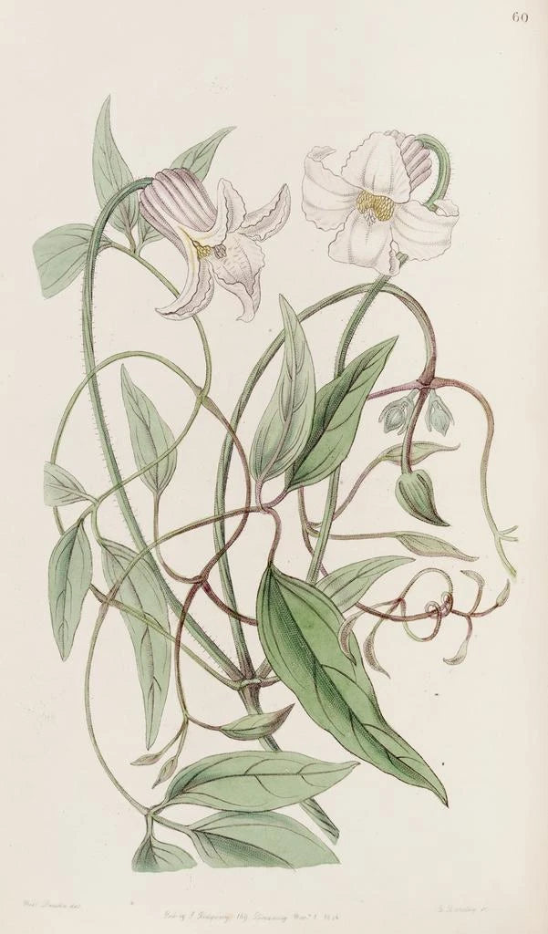 De clematis met gekrulde bloemen, een werk van Sydenham Edwards, is een viering van de natuur door middel van een levendig palet en minutieuze details. De delicate bloemblaadjes, met golvende contouren, lijken te leven onder het licht, waardoor een bijna betoverende sfeer ontstaat. De aquareltechniek, vakkundig toegepast, maakt het mogelijk om de transparantie en lichtheid van de bloemen vast te leggen, terwijl de subtiel getinte achtergrond de schoonheid van deze klimplant benadrukt. Elke penseelstreek vertelt een verhaal en nodigt de kijker uit om onder te dompelen in een wereld waar botanica en kunst harmonieus samenkomen.