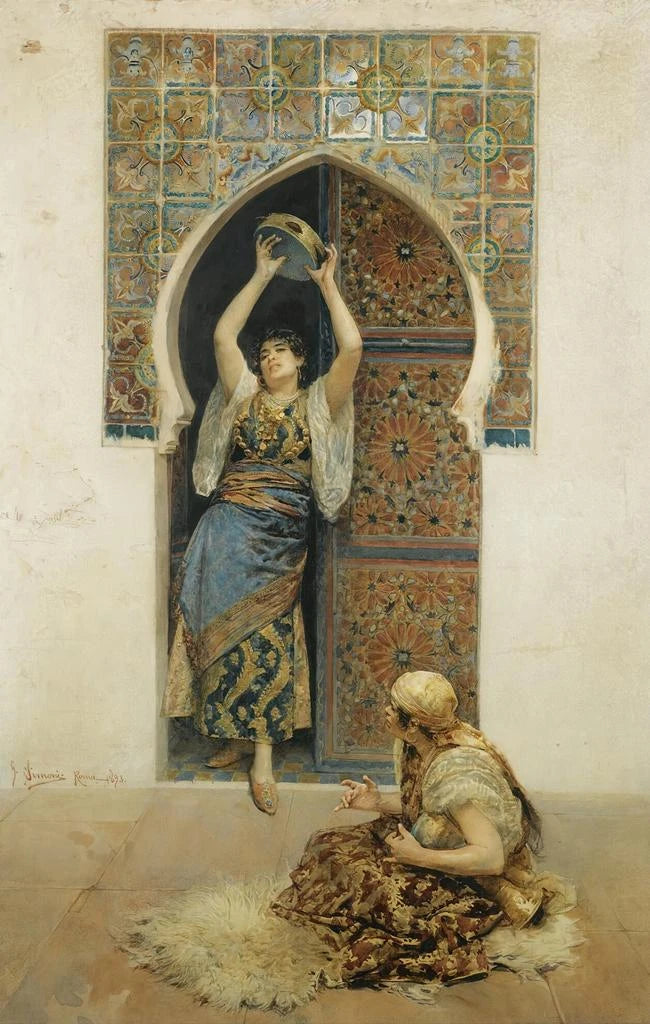 Dans "La Danse", Gustavo Simoni capture l'essence même de la joie et de l'énergie humaine à travers une composition vibrante et dynamique. Les couleurs éclatantes, allant des rouges profonds aux jaunes lumineux, créent une atmosphère festive qui invite le spectateur à se laisser emporter par le rythme de la danse. La technique de Simoni, mêlant impressionnisme et réalisme, donne vie aux personnages qui semblent presque sortir de la toile. Chaque mouvement est figé dans le temps, mais l'œuvre respire une telle vitalité qu'on peut presque entendre la musique qui accompagne cette danse enjouée.