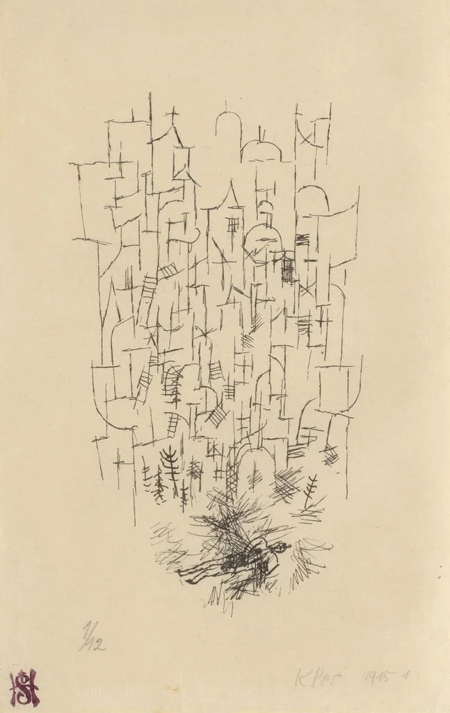 Paul Klee, geboren in 1879 in Zwitserland, is een van de iconische figuren van de moderne kunst. Zijn artistieke parcours wordt gekenmerkt door diverse invloeden, variërend van symbolisme tot expressionisme, en cubisme. Klee was lid van het Bauhaus, waar hij theorieën over kleur en vorm ontwikkelde. "De dood voor het idee" past in een periode waarin de kunstenaar filosofische en psychologische concepten verkent, en zijn reflecties vertaalt in krachtige beelden. Zijn werk, rijk aan symboliek, blijft vragen oproepen en inspireren generaties kunstenaars en kunstliefhebbers.