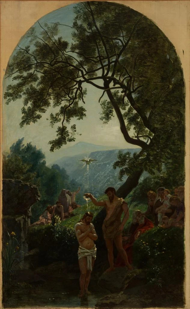François-Louis Français, actief in de 19e eeuw, wordt erkend om zijn romantische en poëtische benadering van schilderkunst. Geïnspireerd door de grote meesters van de Renaissance en het Barok, wist hij elementen van licht en kleur te integreren die diepe emoties oproepen. Zijn carrière, gekenmerkt door een zoektocht naar spiritualiteit en schoonheid, werd gevoed door reizen naar Italië en ontmoetingen met andere kunstenaars van zijn tijd. "Le Baptême du Christ" past binnen een periode waarin religieuze kunst een heropleving doormaakt, wat de betekenis van geloof in de samenleving van die tijd onderstreept.