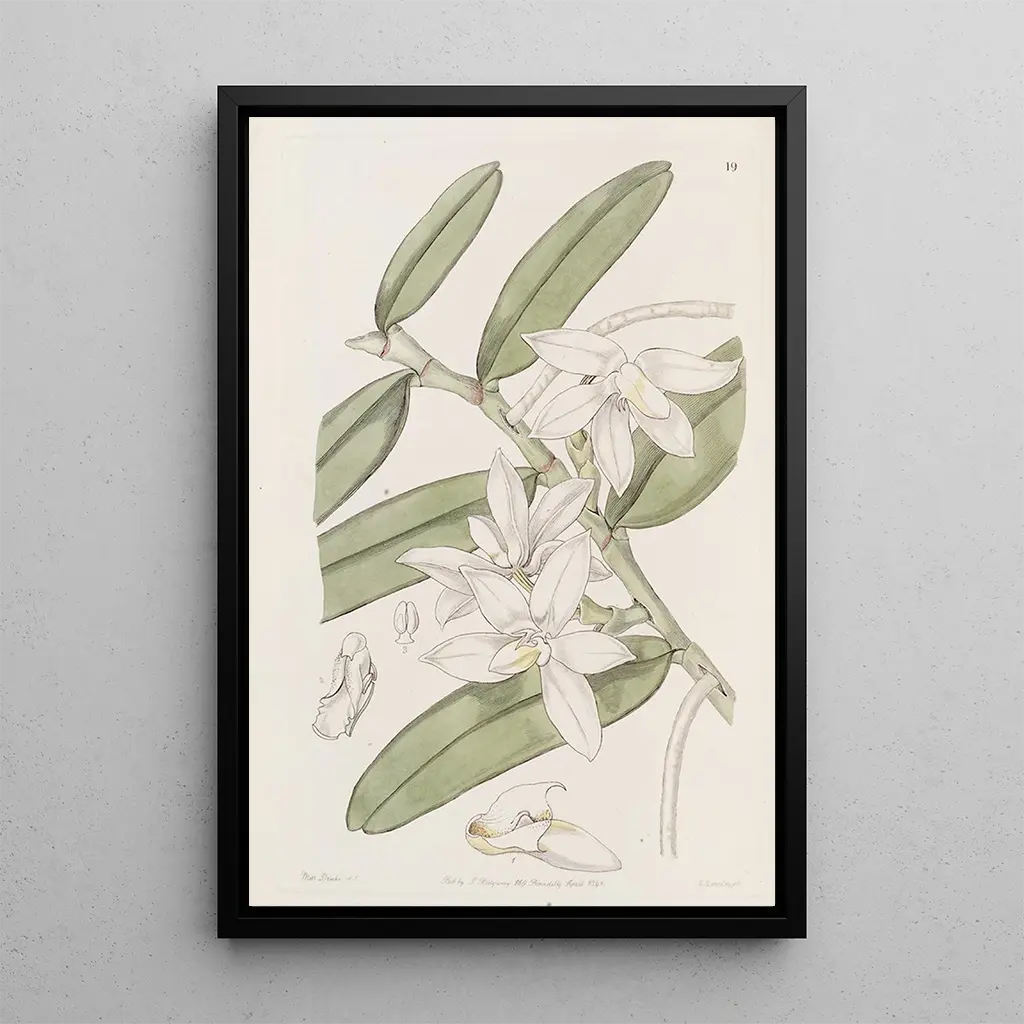De Fleshlip à pantoufles, een fascinerende plant, wordt onthuld in een delicate compositie waar de nuances van groen en violet zich verweven. Deze kunstdruk belicht de minutieuze details van zijn bladeren, die een sfeer oproepen die zowel rustgevend als intrigerend is. De illustratietechniek van Sydenham Edwards, met zijn fijne lijnen en levendige kleuren, nodigt uit tot een aandachtige contemplatie, en onthult de verborgen schoonheid van deze botanische soort. Elk element van het doek lijkt de essentie van de natuur vast te leggen, en biedt een blik op een rijke en gevarieerde plantenwereld.