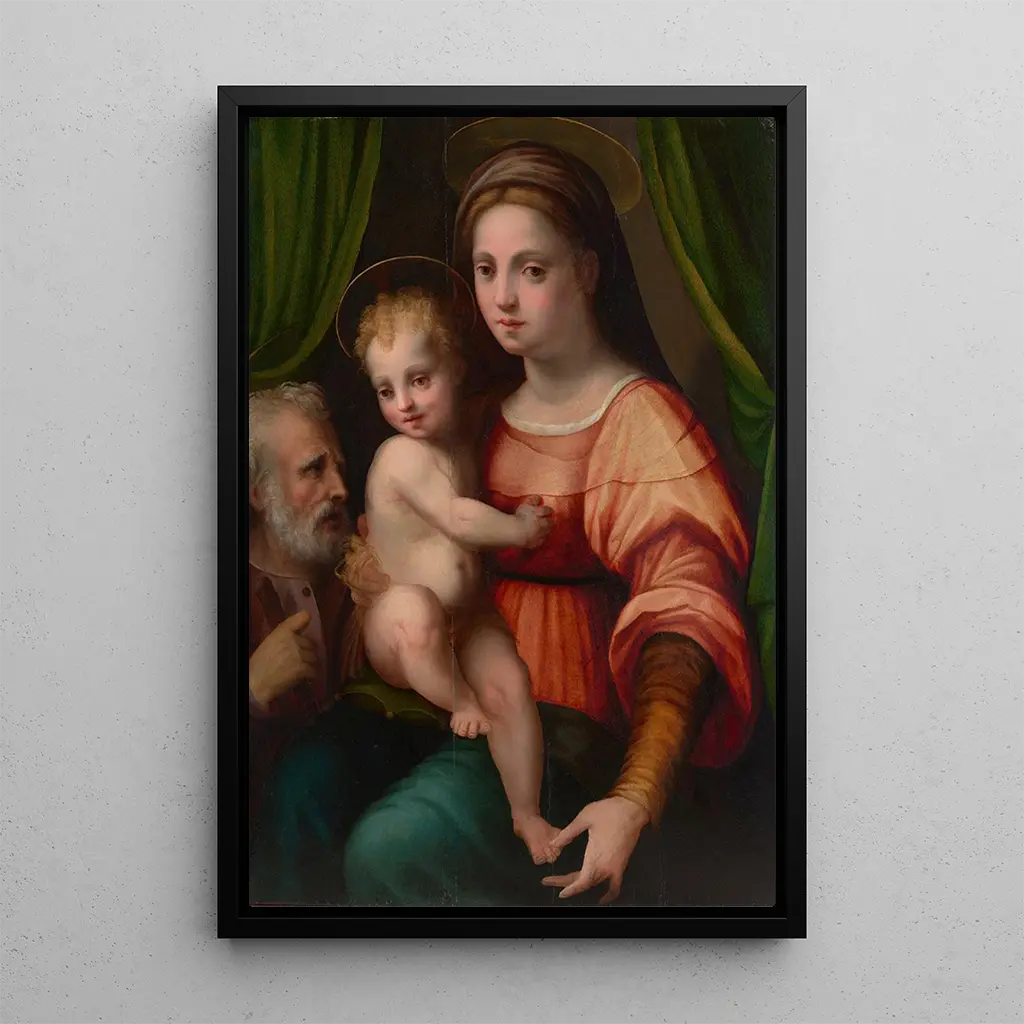La kunstdruk de La Sainte Famille évoque une atmosphère de sérénité et de protection. Les figures de Marie, Joseph et l'Enfant Jésus sont représentées avec une tendresse palpable, leurs expressions douces et bienveillantes. Les couleurs chaudes, dominées par des tons ocre et dorés, créent une ambiance chaleureuse, tandis que la lumière semble émaner de la scène elle-même, illuminant les visages des personnages. La technique de Domenico Puligo, mélangeant le clair-obscur et des détails minutieux, donne vie à cette œuvre, invitant le spectateur à contempler la beauté de la vie familiale sacrée.