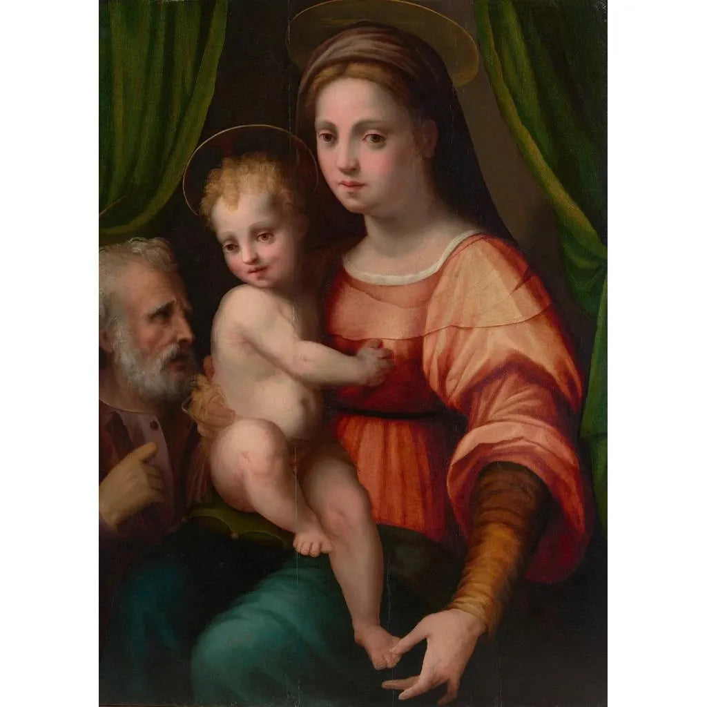 Domenico Puligo, actif au XVIe siècle, est un artiste de la Renaissance italienne dont le travail reflète les influences de ses contemporains, notamment Michel-Ange et Raphaël. Évoluant dans le contexte florentin, il a su allier tradition et innovation, créant des œuvres qui témoignent de la richesse spirituelle de son époque. Bien que moins connu que certains de ses pairs, Puligo a su marquer son empreinte par des compositions harmonieuses et des représentations touchantes de la vie religieuse. La Sainte Famille est un exemple emblématique de son style, illustrant son talent pour capturer l'émotion et la dévotion.