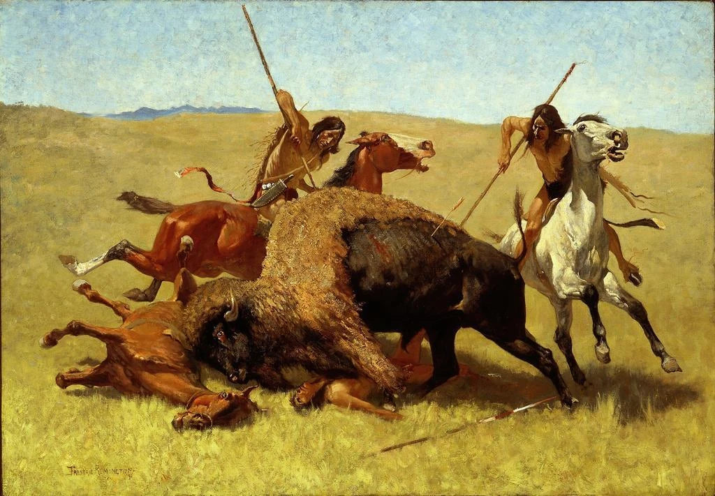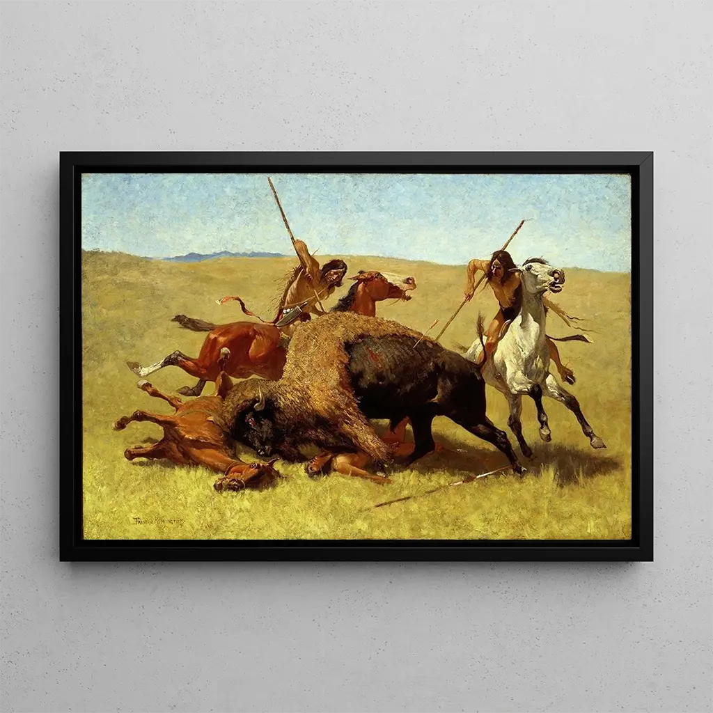 La chasse au bison : een eerbetoon aan de wilde fauna "De jacht op bizons" van Frederic Remington is een kunstdruk die de essentie van het Amerikaanse Westen vastlegt. In deze dynamische scène worden de bizons afgebeeld in een krachtige beweging, terwijl de jagers, in volle actie, een voelbare spanning aan de compositie toevoegen. De aardse kleuren en de minutieuze details van de dieren en ruiters creëren een levendige en meeslepende sfeer. Remington, met zijn talent voor beeldhouwen en schilderen, slaagt erin de ruwe kracht van de natuur en de avontuurlijke geest die deze periode kenmerkt, over te brengen. Frederic Remington : de illustrator van het Amerikaanse Westen Frederic Remington, actief aan het einde van de 19e eeuw, is beroemd om zijn weergaven van het leven in het Amerikaanse Westen. Geïnspireerd door zijn reizen en ontmoetingen met de inheemse volkeren, wist hij de cultuur, fauna en flora van deze regio vast te leggen. Zijn stijl, die realisme en romantiek combineert, heeft het beeld gevormd dat wij tegenwoordig van het wilde Westen hebben. "De jacht op bizons" is een van zijn iconische kunstdrukken, die zijn inzet toont om scènes uit het grensleven te vereeuwigen en een eerbetoon te brengen aan de majesteit van de natuur. Een decoratieve aankoop met vele voordelen Kiezen voor de kunstdruk van "De jacht op bizons" voor uw interieurdecoratie is een uitstekend idee om een vleugje geschiedenis en avontuur aan uw ruimte toe te voegen. Of het nu in een woonkamer, kantoor of speelkamer is, dit schilderij roept de grootsheid van de natuur en de pioniersgeest op. De afdrukkwaliteit garandeert een perfecte fideliteit aan de details en kleuren van het originele kunstwerk, waardoor deze doek een echt middelpunt wordt. Door dit kunstwerk in uw decor te integreren, creëert u een boeiende sfeer die de verbeelding stimuleert en uitnodigt tot ontsnapping.
