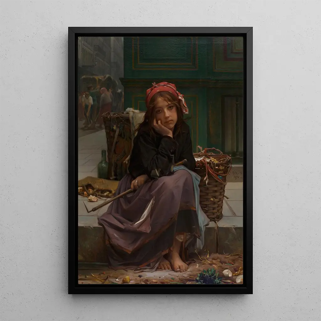 In "De jonge verkoopster van chiffons" dompelt Guillaume Charles Brun ons onder in een scène uit het dagelijks leven, waar een jonge jongen, met een vastberaden blik, probeert zijn waren te verkopen. De felle kleuren en de gedetailleerde weergave van het doek roepen de energie en vitaliteit van de jeugd op, terwijl ze tegelijkertijd de harde realiteit van zijn bestaan benadrukken. De compositie benadrukt het contrast tussen de onschuld van de kindertijd en de uitdagingen van de volwassen wereld. Brun's techniek, die realisme en expressiviteit combineert, maakt dit moment zowel ontroerend als inzichtgevend in de sociale strijd van zijn tijd.