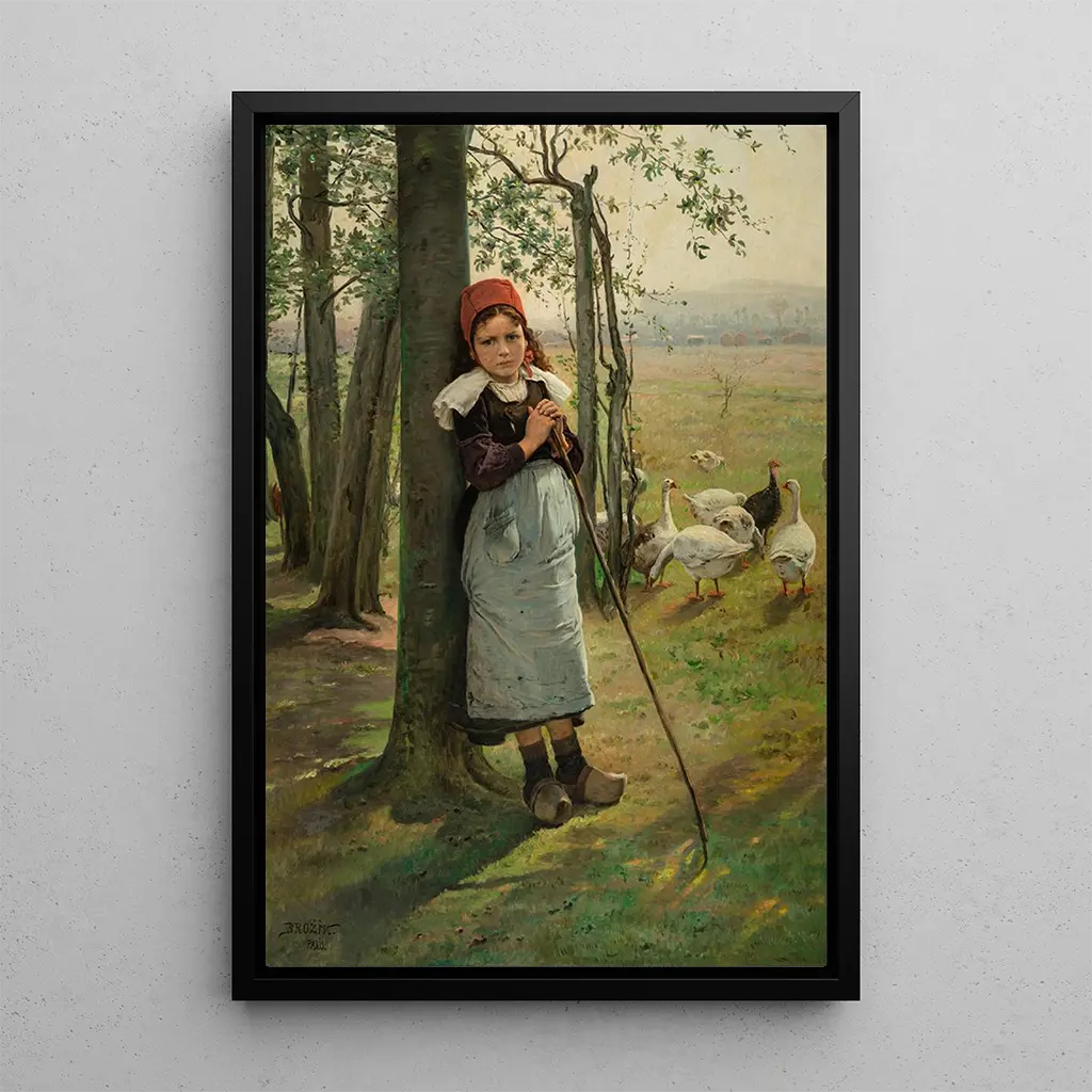 La Petite Gardienne d'oies, een iconisch kunstdruk van Václav Brožík, dompelt ons onder in een pastoralistisch universum waar de eenvoud van het landelijke leven samengaat met een delicate poëzie. De compositie benadrukt een jong meisje, omringd door ganzen, waarvan de witte veren contrasteren met de warme tinten van het landschap. De pastelkleuren en het spel van licht creëren een serene en rustgevende sfeer, uitnodigend tot contemplatie. De techniek van de kunstenaar, die realisme en impressionisme combineert, laat de frisheid van de lucht en het geruis van de bladeren voelen, waardoor deze scène levendig en ontroerend wordt.