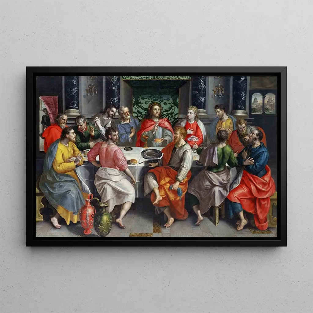 De kunstdruk van La Cène, een iconisch werk van Maerten de Vos, dompelt ons onder in een sfeer die zowel heilig als intiem is. De personages, gerangschikt rond een rijk versierde tafel, lijken gevangen in een moment van openbaring en spanning. De warme kleuren en de schaduweffecten versterken het drama van de scène, terwijl de clair-obscur-techniek een verbluffende diepte aan het geheel geeft. Elk gezicht vertelt een verhaal, elke beweging is geladen met betekenis, en nodigt de kijker uit om dit cruciale moment uit de christelijke traditie te overwegen.