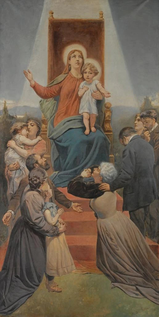 La Madone des nécessiteux, een ontroerende kunstdruk van Hermann Eichler, roept een diepe menselijkheid op door zijn centrale onderwerp. De compositie toont een beschermende Maagd Maria, omringd door kinderen en mensen in nood, alles badend in zacht en warm licht. De pastelkleuren, gedomineerd door tinten blauw en roze, creëren een rustgevende, bijna troostende sfeer. De techniek van de kunstenaar, die realisme combineert met impressionistische accenten, nodigt uit tot een aandachtige contemplatie, waarbij de fijne details van gezichten en kleding worden onthuld. Dit doek, met zijn universele boodschap, raakt het hart en herinnert aan het belang van solidariteit.