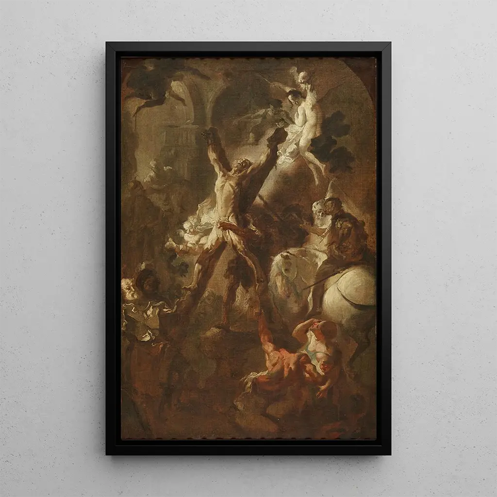 Dans Le martyre de saint André, Franz Anton Maulbertsch dépeint avec une intensité dramatique la souffrance du saint. Les couleurs vives et les contrastes saisissants créent une atmosphère à la fois tragique et captivante. La composition, centrée sur la figure du martyr, attire immédiatement l'œil et évoque une profonde empathie. Les détails minutieux des expressions et des postures des personnages renforcent la narration visuelle, plongeant le spectateur dans un moment de tension spirituelle et physique, où la foi triomphe de la douleur.