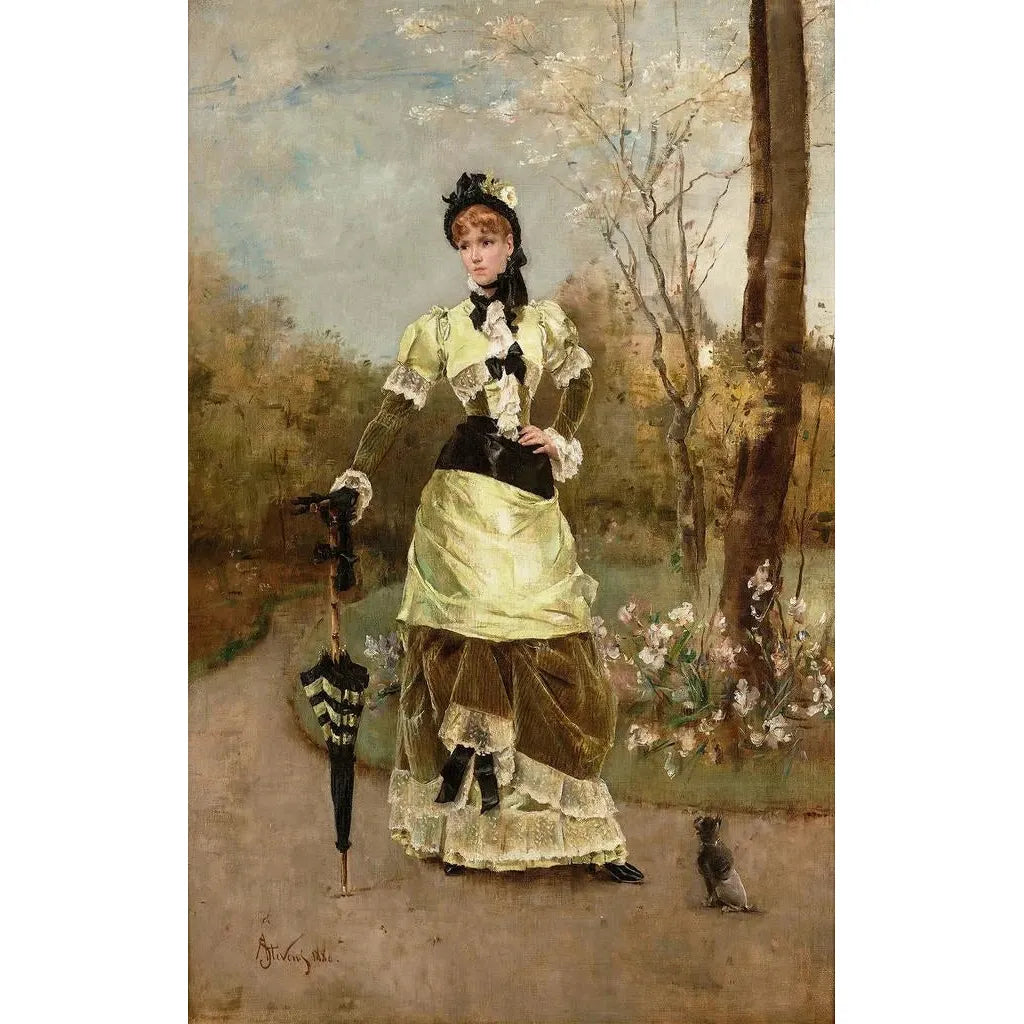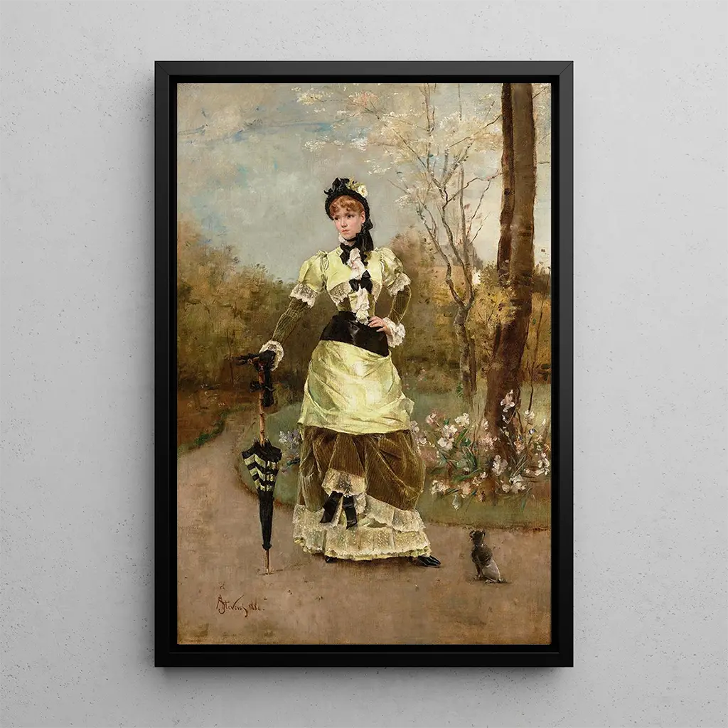 De Parisienne, een iconisch kunstdruk van Alfred Stevens, beeldt een vrouw af met onweerstaanbare charme, die de elegantie en verfijning van de Parijse vrouw uit de 19e eeuw belichaamt. De compositie benadrukt verfijnde details, zoals de plooien van haar jurk en de delicate accessoires die haar schoonheid accentueren. De rijke en levendige kleuren, gecombineerd met subtiel licht, creëren een sfeer van luxe en glamour. Stevens excelleert in het weergeven van texturen, waardoor de zachtheid van de stoffen en de glans van de sieraden bijna tastbaar worden, wat deze kunstdruk een tactiele en levendige dimensie geeft.