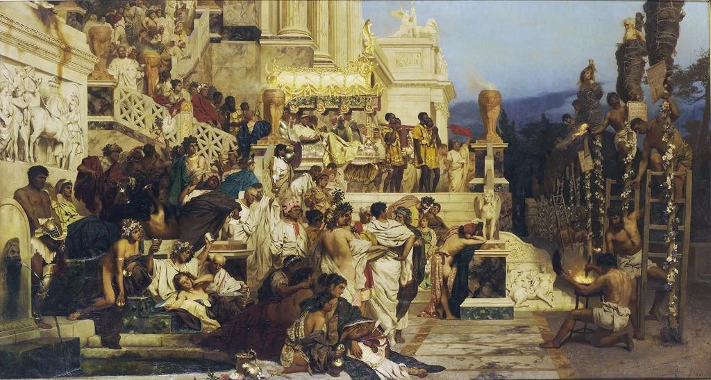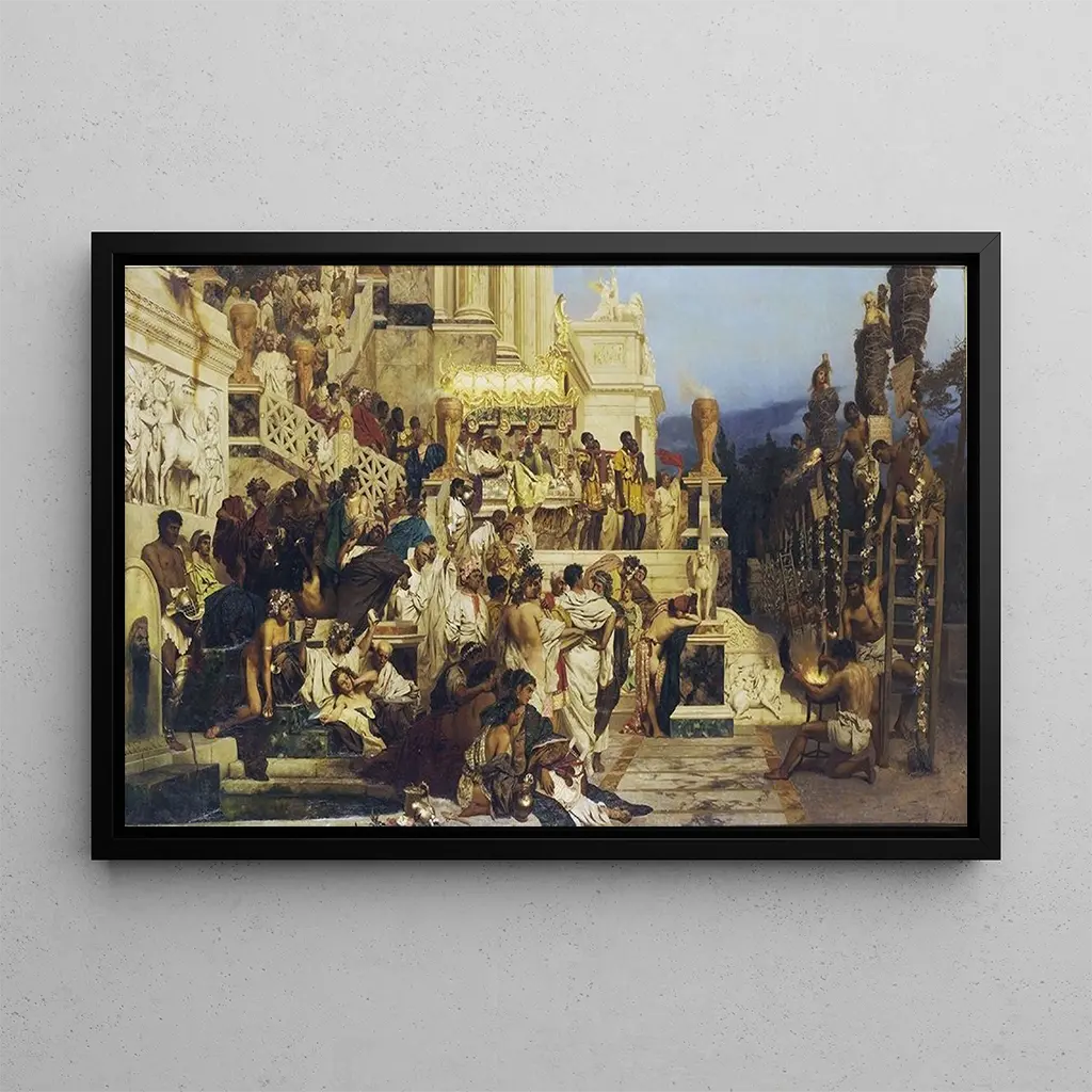 Les Torches de Néron : een historische dramatische kunstdruk in licht "Les Torches de Néron" van Henryk Siemiradzki is een indrukwekkend werk dat de kijker onderdompelt in een dramatische scène uit de oudheid. Het doek, rijk aan levendige kleuren en contrasten, beeldt menselijke figuren af die door fakkels worden verlicht, waardoor een sfeer ontstaat die zowel feestelijk als tragisch is. De minutieuze details van de kostuums en gezichtsuitdrukkingen tonen Siemiradzki's talent om emotie en beweging vast te leggen. De dynamische compositie, met lijnen die de blik leiden, roept een krachtig verhaal op, waarin licht en schaduw een essentiële rol spelen in de visuele vertelling. Henryk Siemiradzki : een virtuoos van het neoclassicisme Henryk Siemiradzki, een Poolse schilder uit de 19e eeuw, is beroemd om zijn neoclassicistische werken die strenge academische discipline combineren met artistieke gevoeligheid. Opgeleid aan de Academie voor Schone Kunsten in Sint-Petersburg, werd hij beïnvloed door de meesters van de Renaissance en het Barok, wat terug te zien is in zijn verfijnde stijl. Siemiradzki wist historische momenten met opmerkelijke precisie vast te leggen, en eer te betonen aan de grootheid van de oudheid. "Les Torches de Néron" illustreert perfect zijn vaardigheid om geschiedenis en kunst te fusioneren, terwijl hij universele thema's zoals passie en macht verkent. Een decoratief kunstwerk met vele voordelen De kunstdruk van "Les Torches de Néron" vormt een boeiende aanvulling op uw interieurdecoratie, of het nu gaat om een woonkamer, eetkamer of kantoor. Zijn visuele intensiteit en historische verhaal maken het een ideaal middelpunt om gesprekken op gang te brengen. De kwaliteit van de kunstdruk garandeert een trouwheid aan het originele werk, waardoor elke nuance en detail kan worden gewaardeerd. Door dit schilderij in uw ruimte te integreren, geeft u uw interieur een vleugje elegantie en cultuur, terwijl u het artistieke erfgoed van een groot meester viert.
