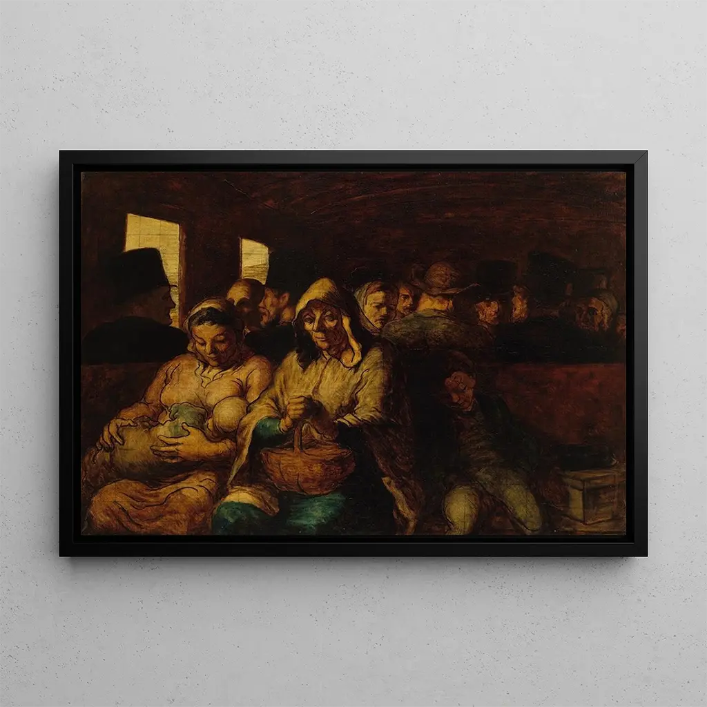 De kunstdruk Le Wagon de Troisième Classe van Honoré Daumier beeldt met opmerkelijke intensiteit het leven van de lagere klassen in de 19e eeuw uit. In dit werk worden de personages afgebeeld in een overvolle treinwagon, die een reis scène illustreert waar nabijheid en vermoeidheid voelbaar zijn. De donkere, aardse kleuren en de expressieve gezichtsuitdrukkingen creëren een sfeer die zowel realistisch als emotioneel is. Daumier, door zijn vaardigheid om de details van het dagelijks leven vast te leggen, dompelt ons onder in een sociale realiteit die vaak over het hoofd wordt gezien, en eert zo de waardigheid van gewone mensen.